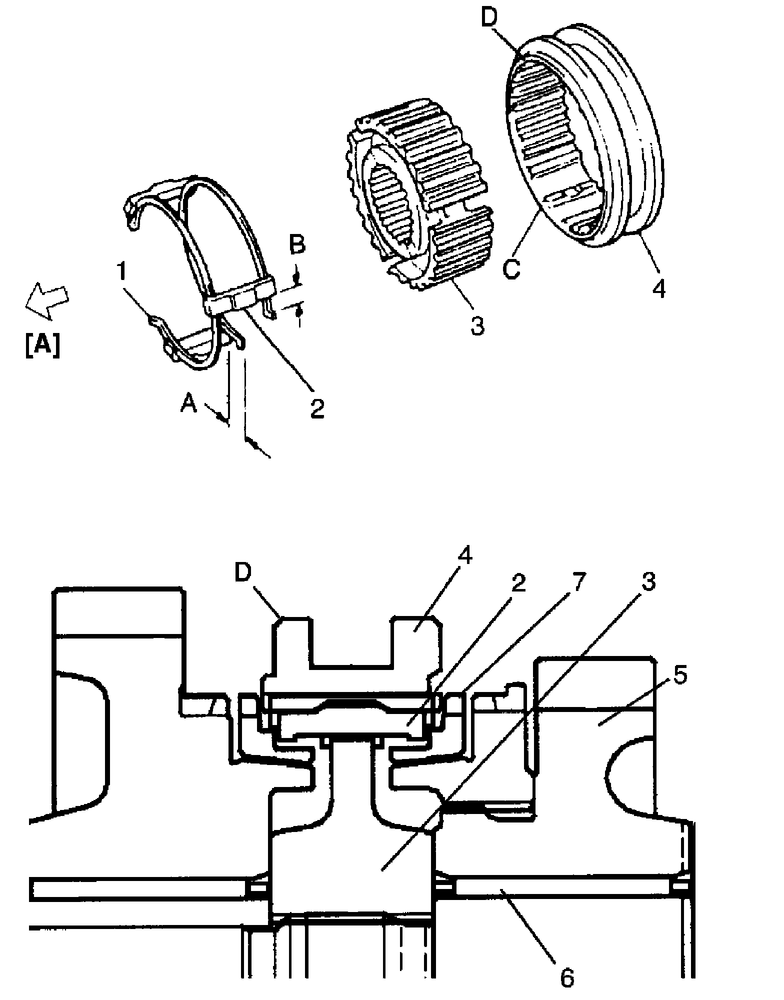 5) Assemble synchronizer sleeve (4) and hub (3) as follows.
