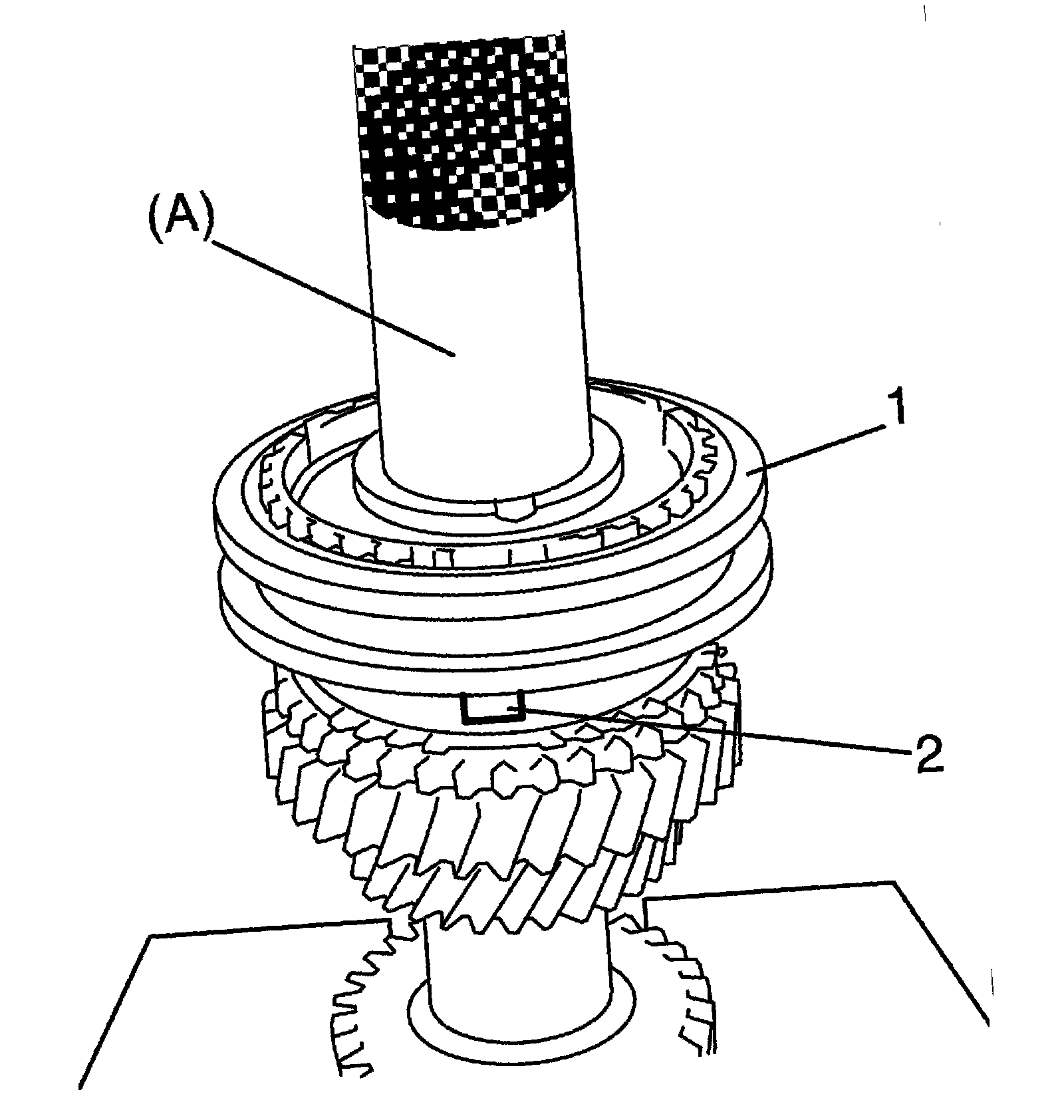 ^ While press-fitting sleeve & hub, make sure that synchronizer ring key slots (2) are aligned with keys in sleeve & hub assembly.