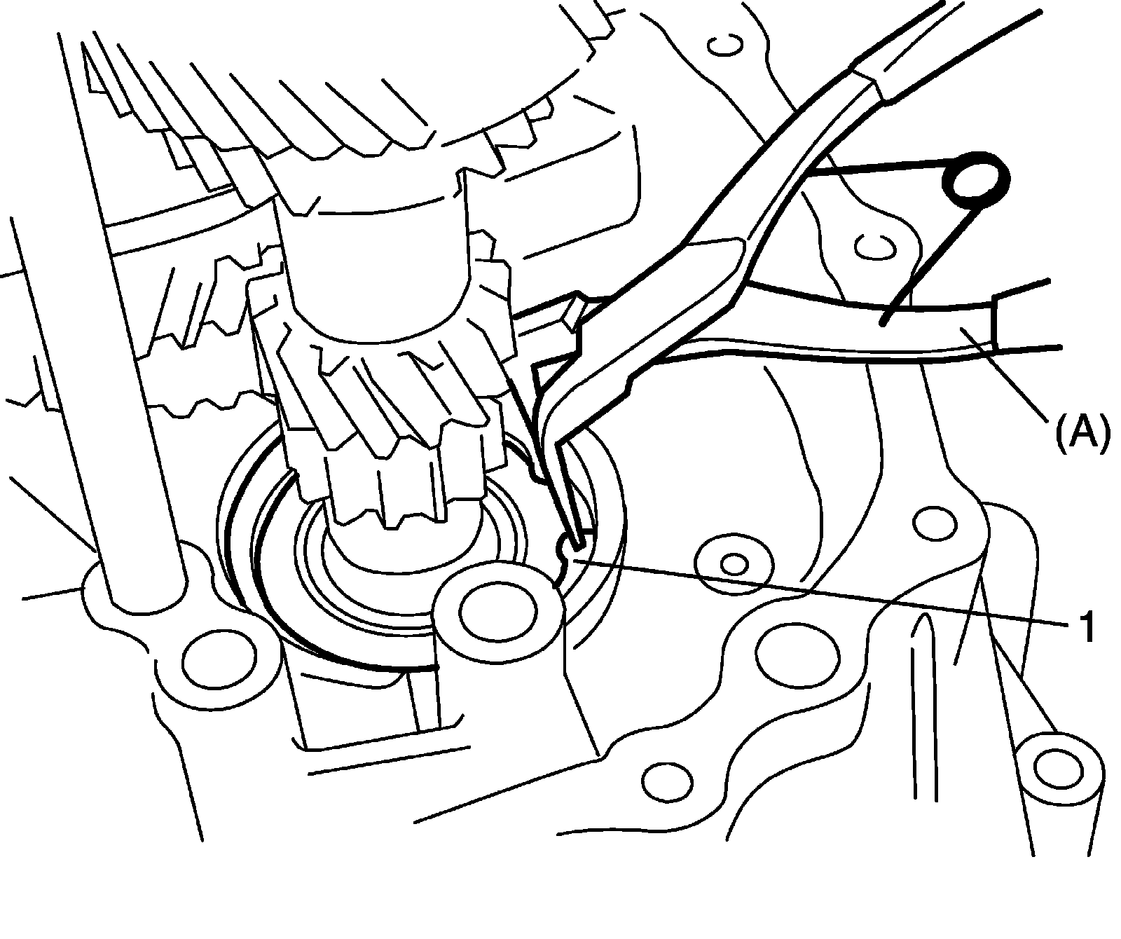 14) Remove input shaft front bearing circlip (1) from case using special tool.
