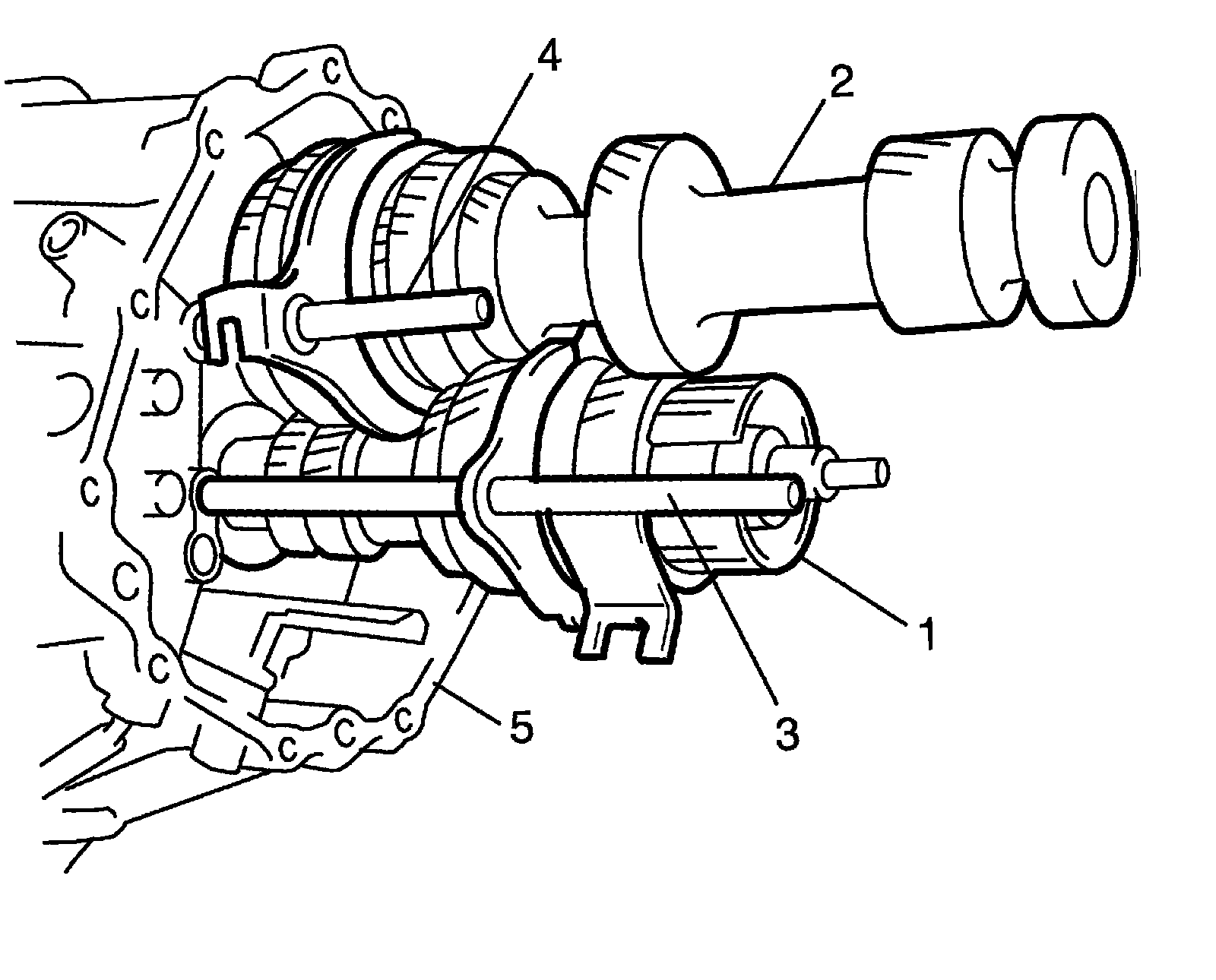 15) Remove input shaft assembly (1), countershaft assembly (2), high speed gear shift fork (3) and low speed gear shift fork (4) as assembly from front case (5) tapping input shaft end by plastic hammer lightly.