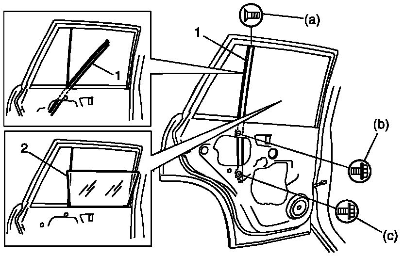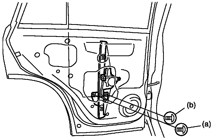- Tighten rear door window mounting screw (a) first and then (b).