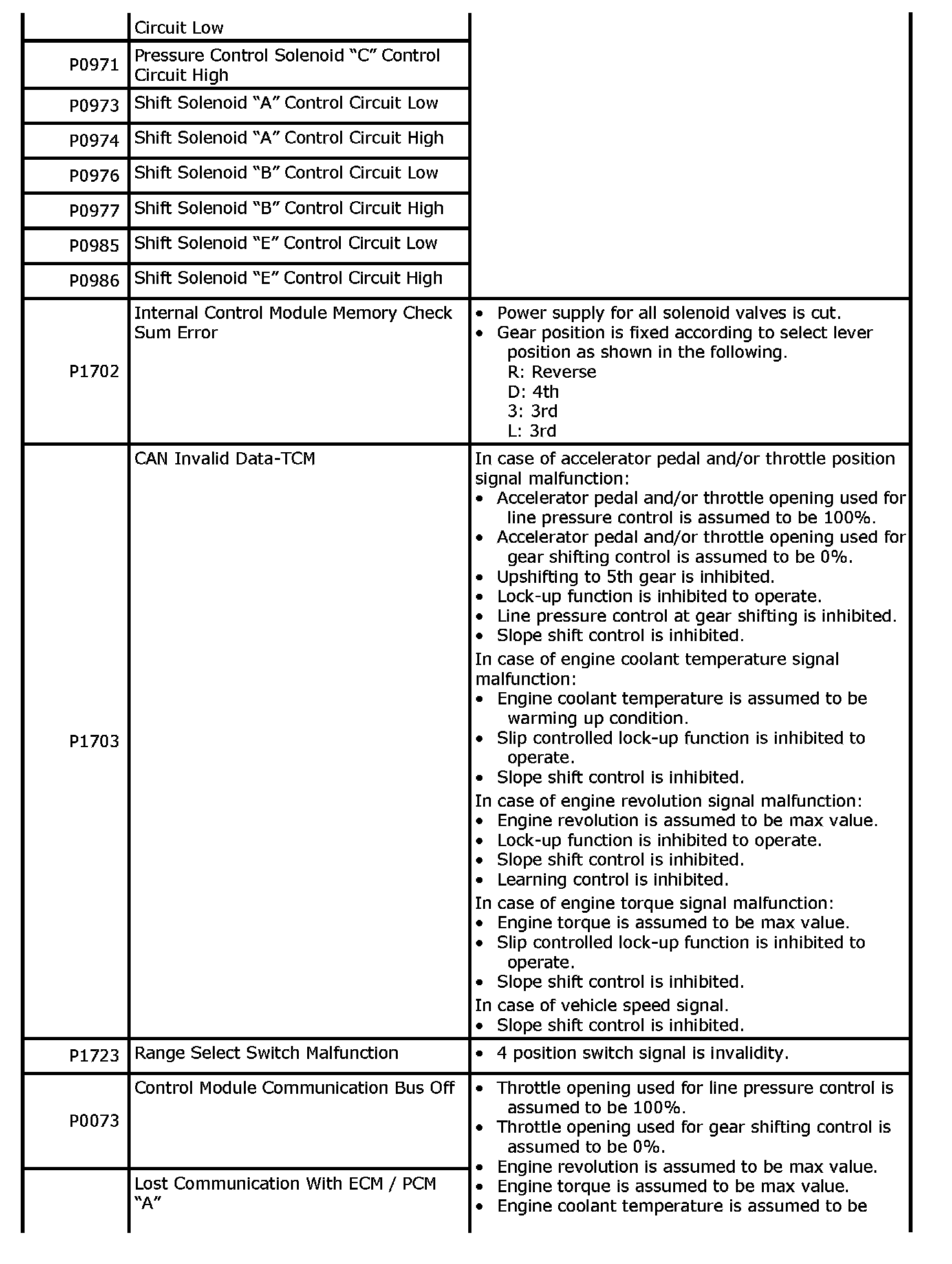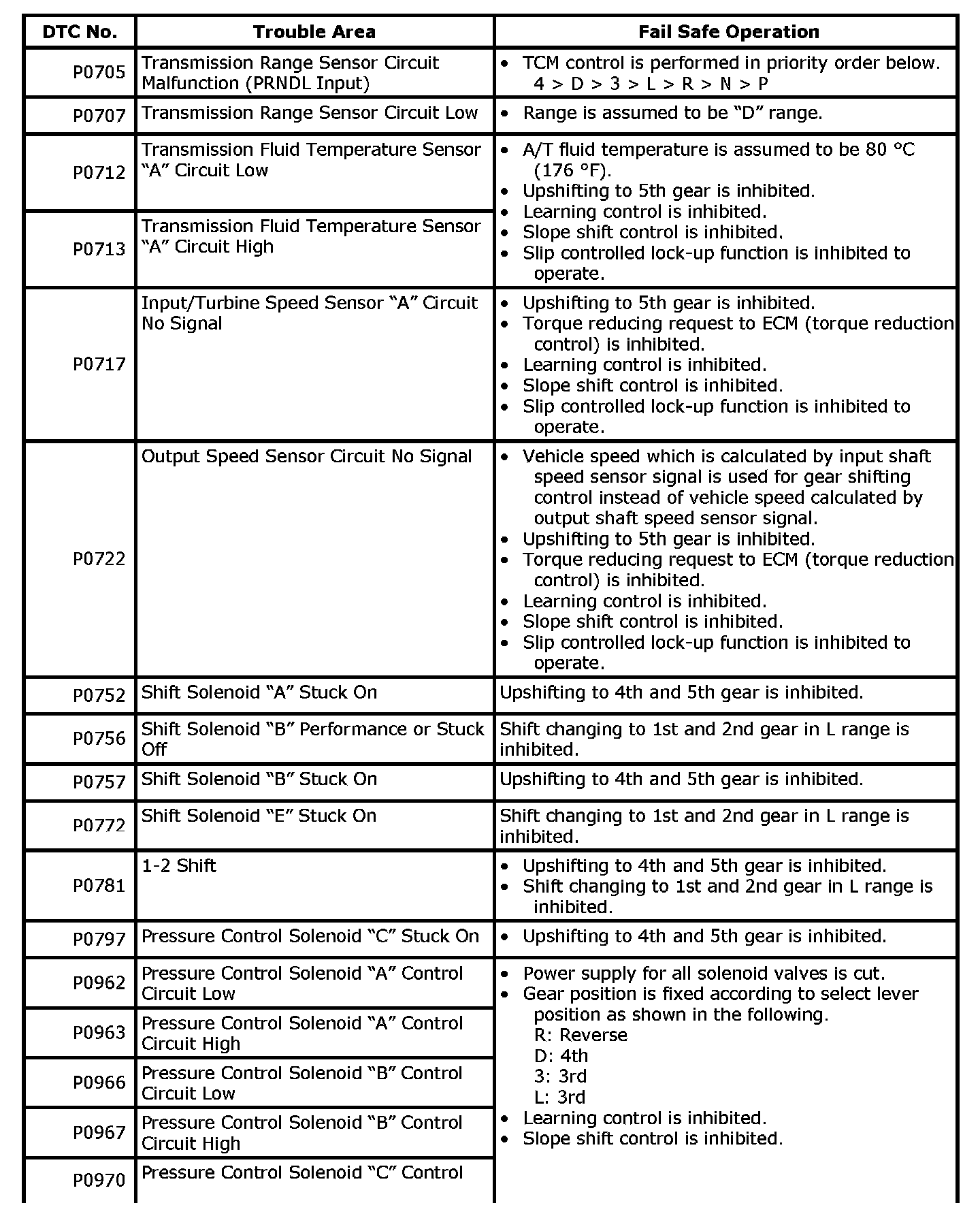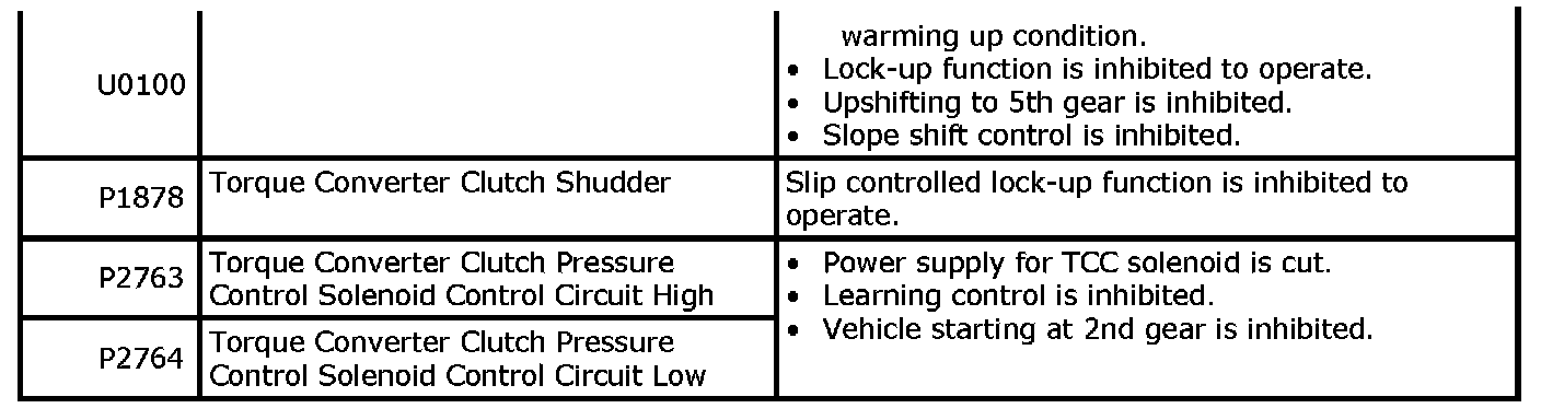 When any of the following DTCs is detected, TCM enters fail-safe mode as long as malfunction continues to exist but that mode is canceled when TCM detects normal condition after that.