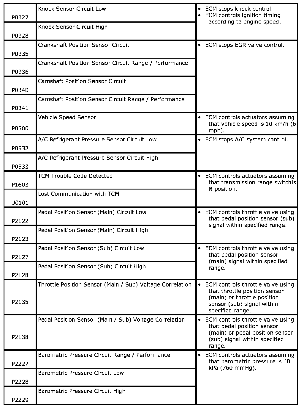When any of the following DTCs is detected, ECM enters fail-safe mode as long as malfunction continues to exist but that mode is canceled when ECM detects normal condition after that.