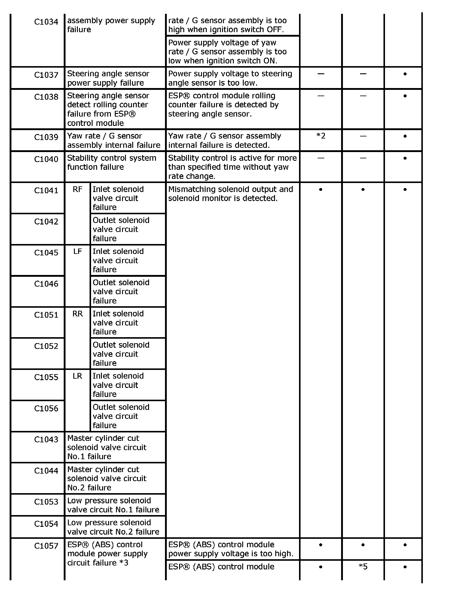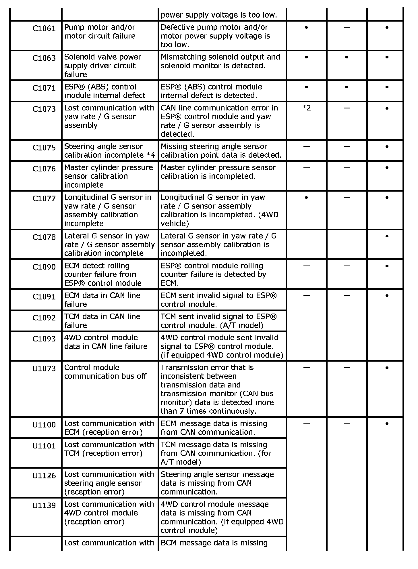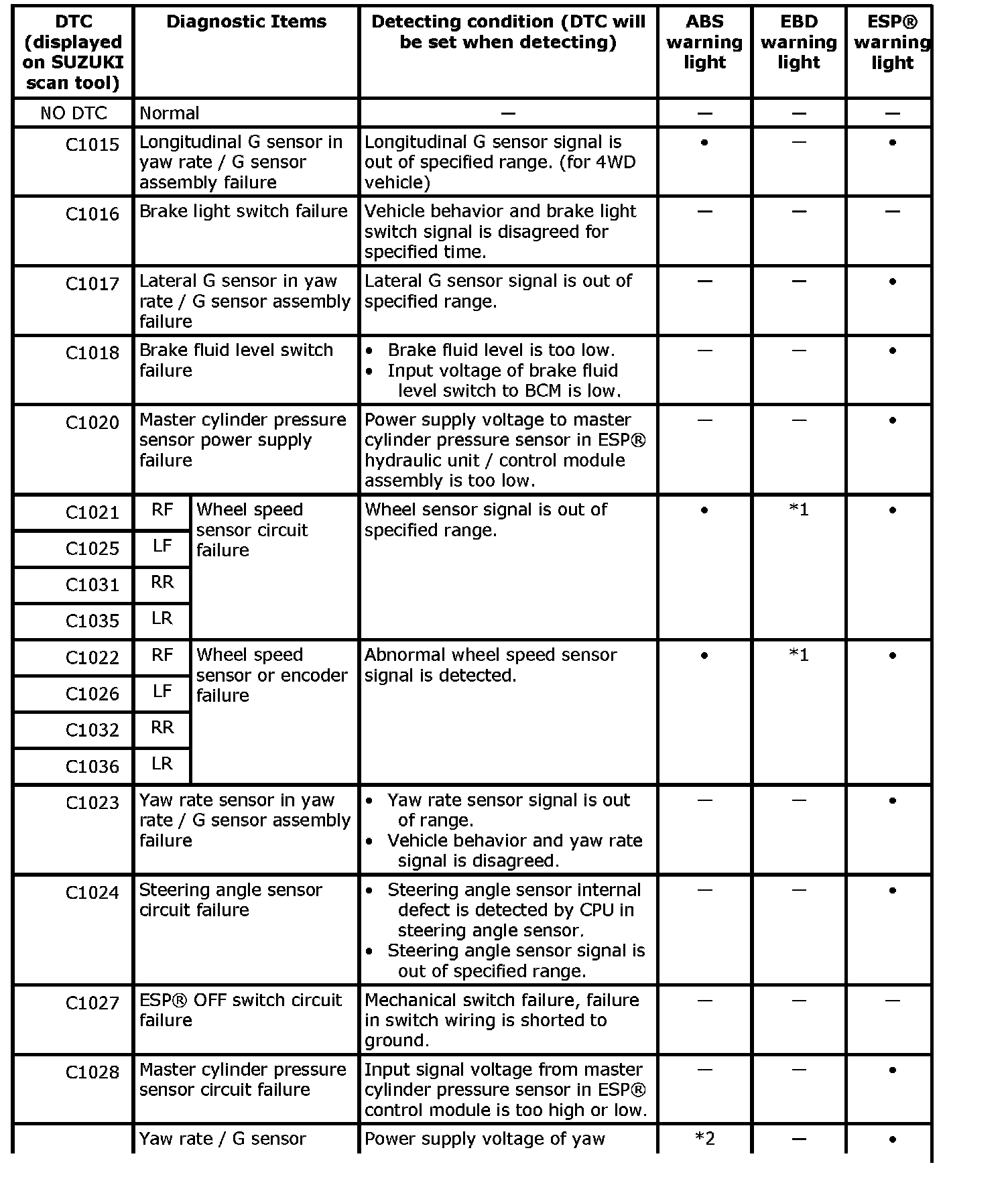^ "-" in ABS warning light, EBD warning light and ESP(R) warning light column of the above table means warning light is lit when DTC is detected.