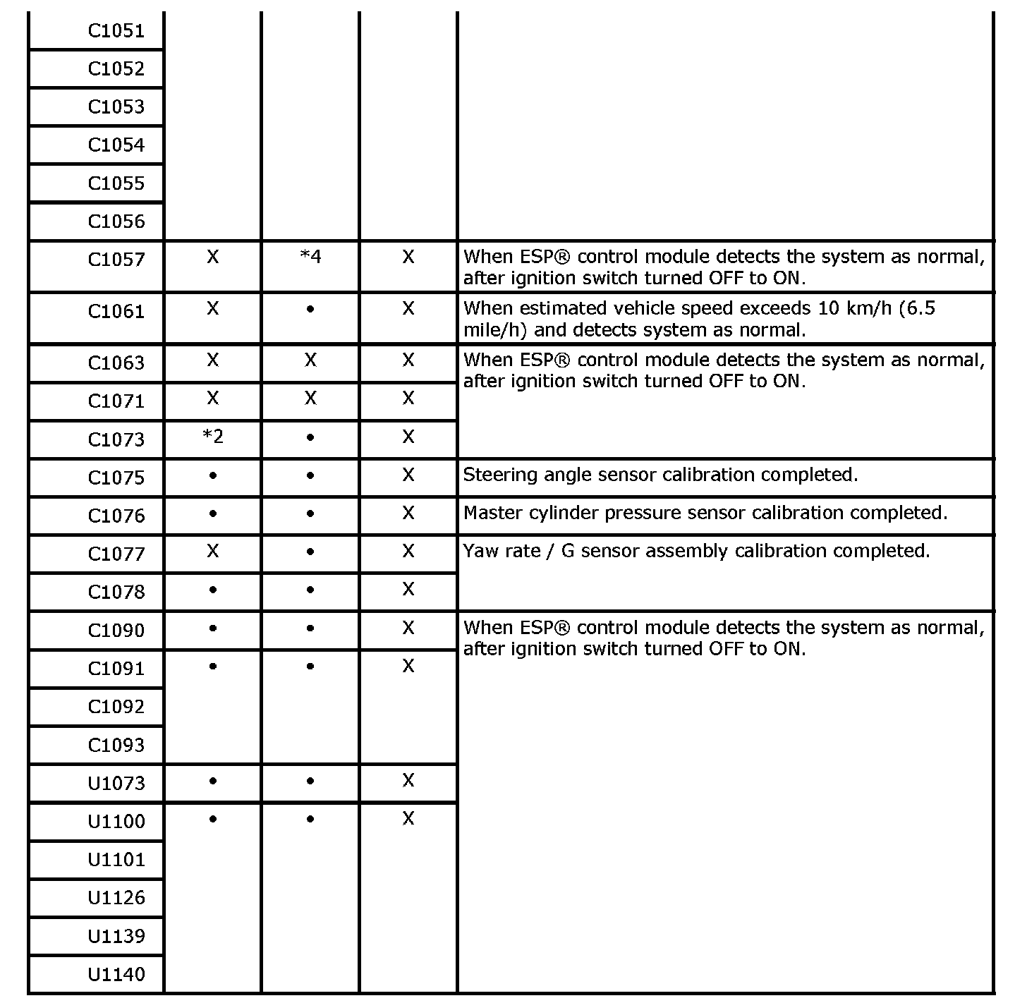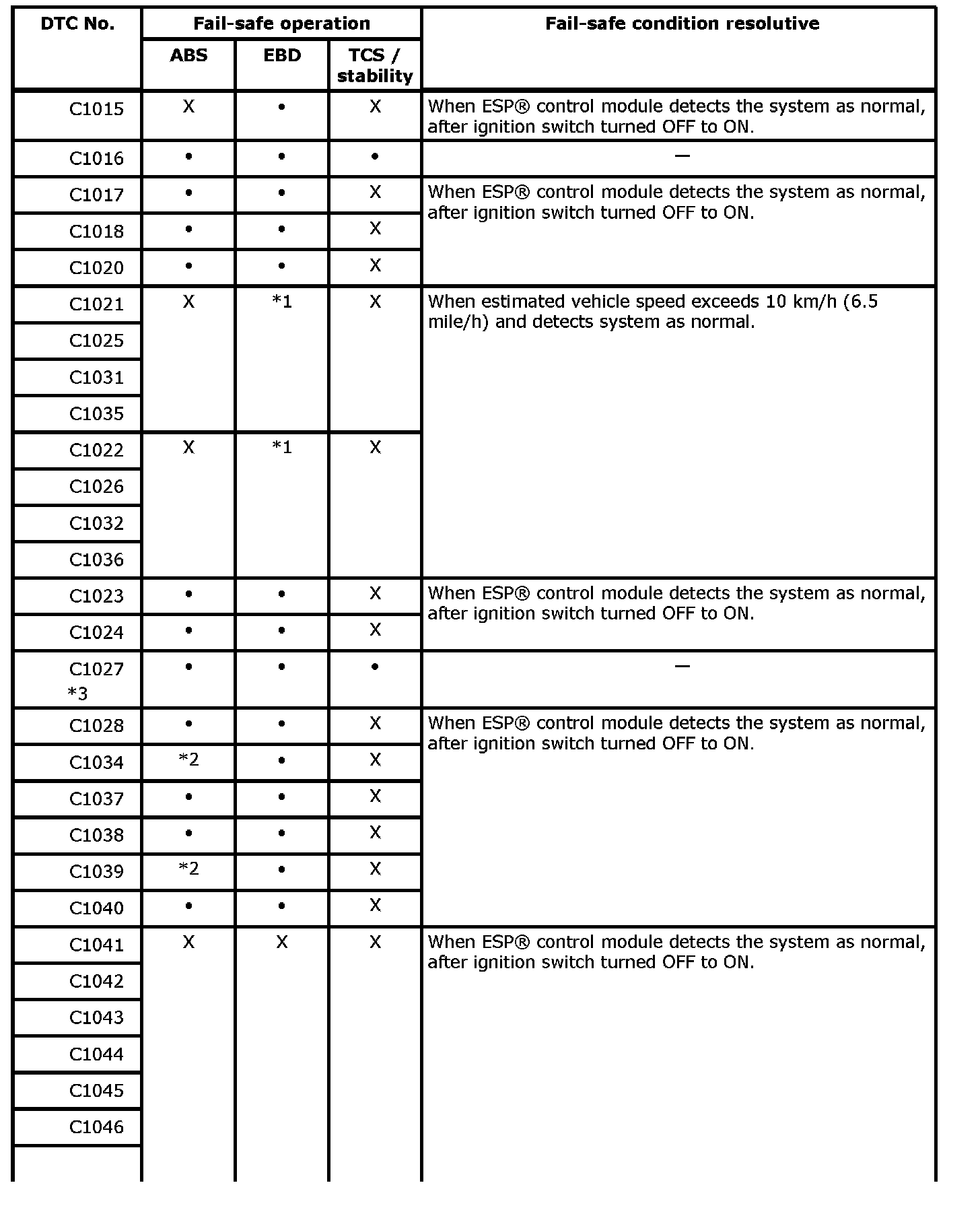 Fail-Safe TableWhen any of the following DTC(s) is detected, ESP(R) system is in fail-safe mode per its DTC and ABS, EBD and/or TCS / stability functions are deactivated until the resolution is applied.