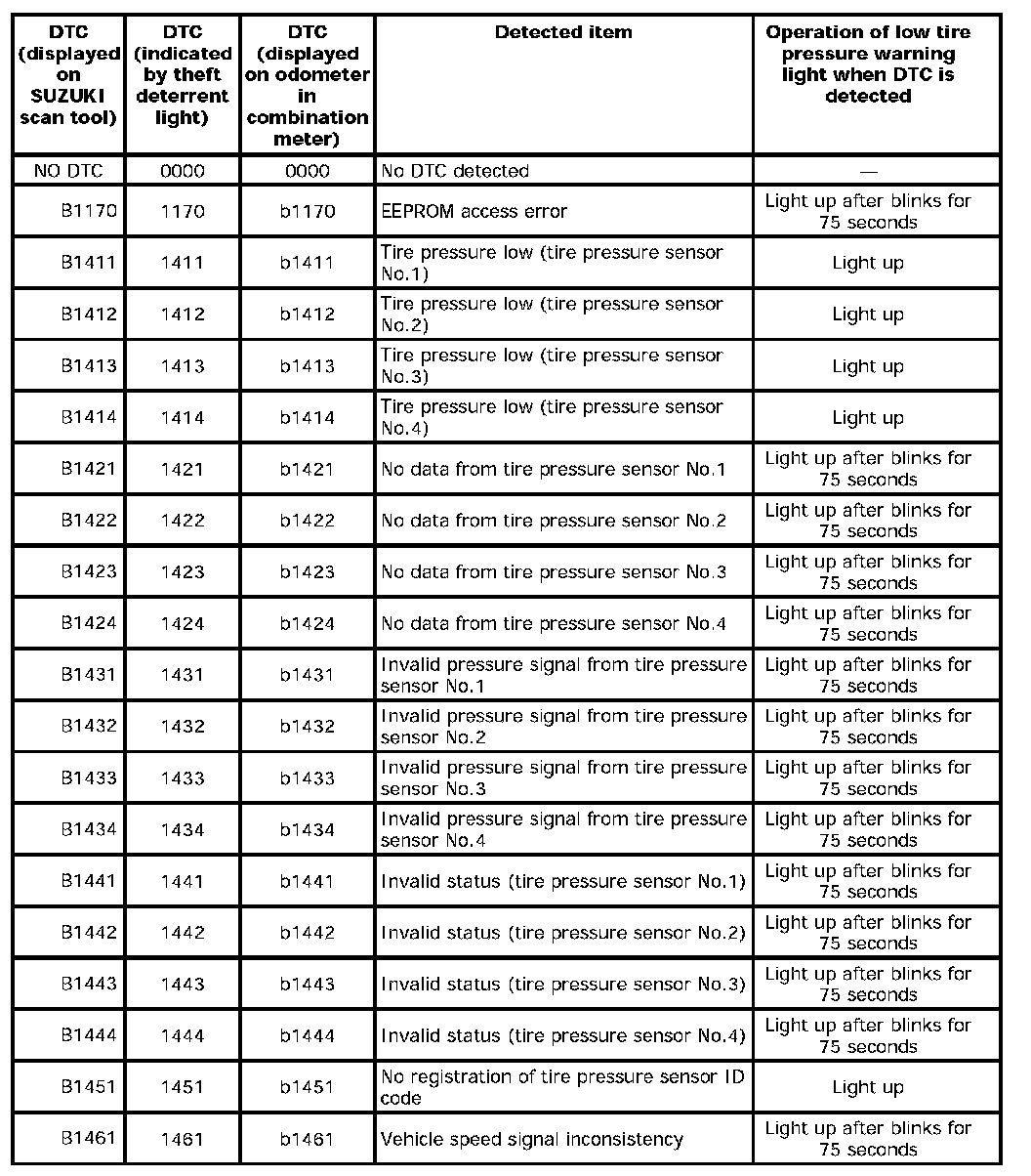 DTC TableCAUTION: Be sure to follow TPMS Check DTC diagnosis, noting Precautions in Diagnosing Troubles.