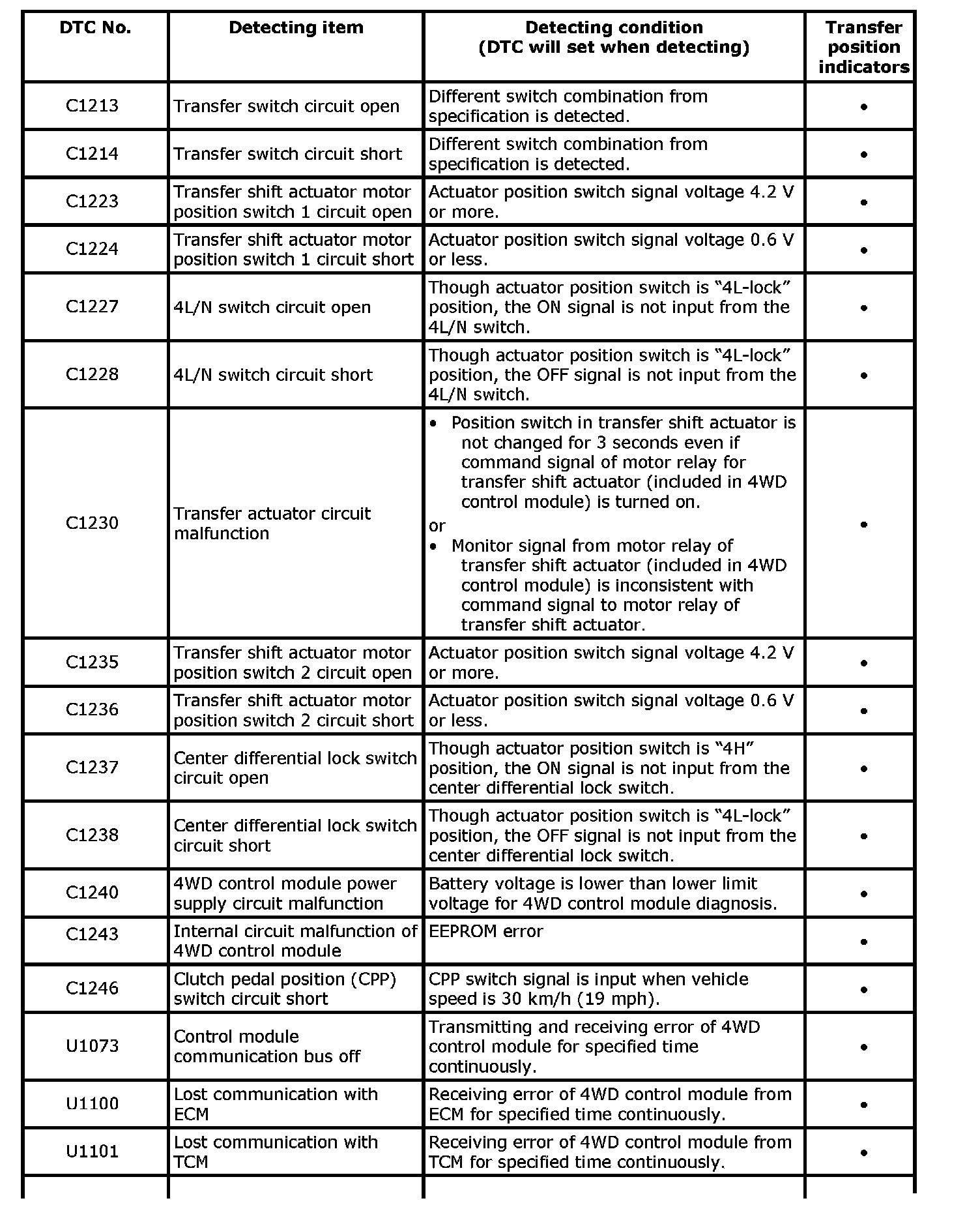 "O" in transfer position indicator column of the above table means indicator lights up when DTC is detected.
