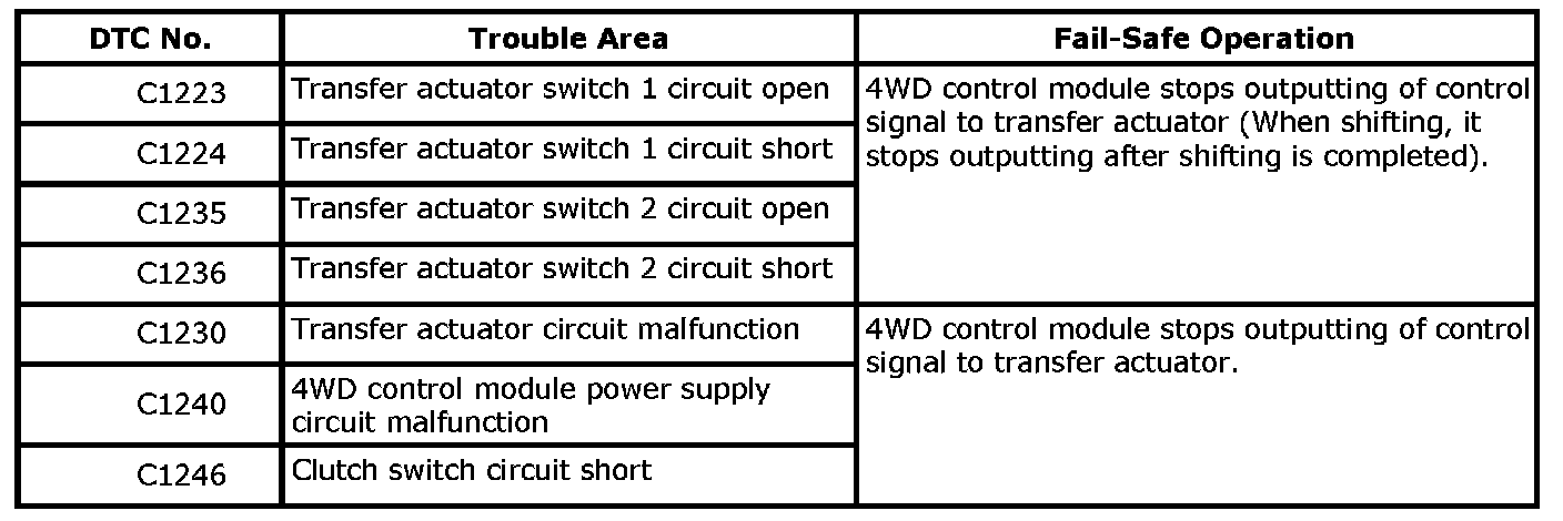 Fail-Safe TableThis function is provided by the safe mechanism that assures safe drive ability even when the actuator, switch, sensor or its circuit fails. The following table shows the fail safe function for each fail condition of sensor, actuator, switch, 4WD control module or its circuit.