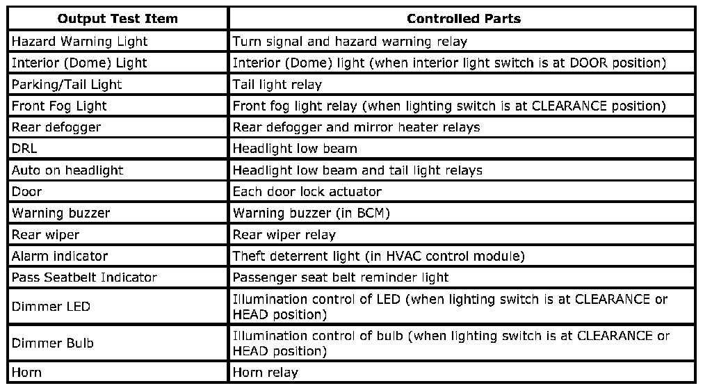 SUZUKI scan tool has the output test function which can force operation of following actuators and relays of the system controlled by BCM. When a malfunction is found in the system controlled by BCM, execute the output test which enables easy judgment whether the malfunction is on the input side or output side of BCM. For detailed information on operation of SUZUKI scan tool, refer to "SUZUKI Scan Tool Operator's Manual".