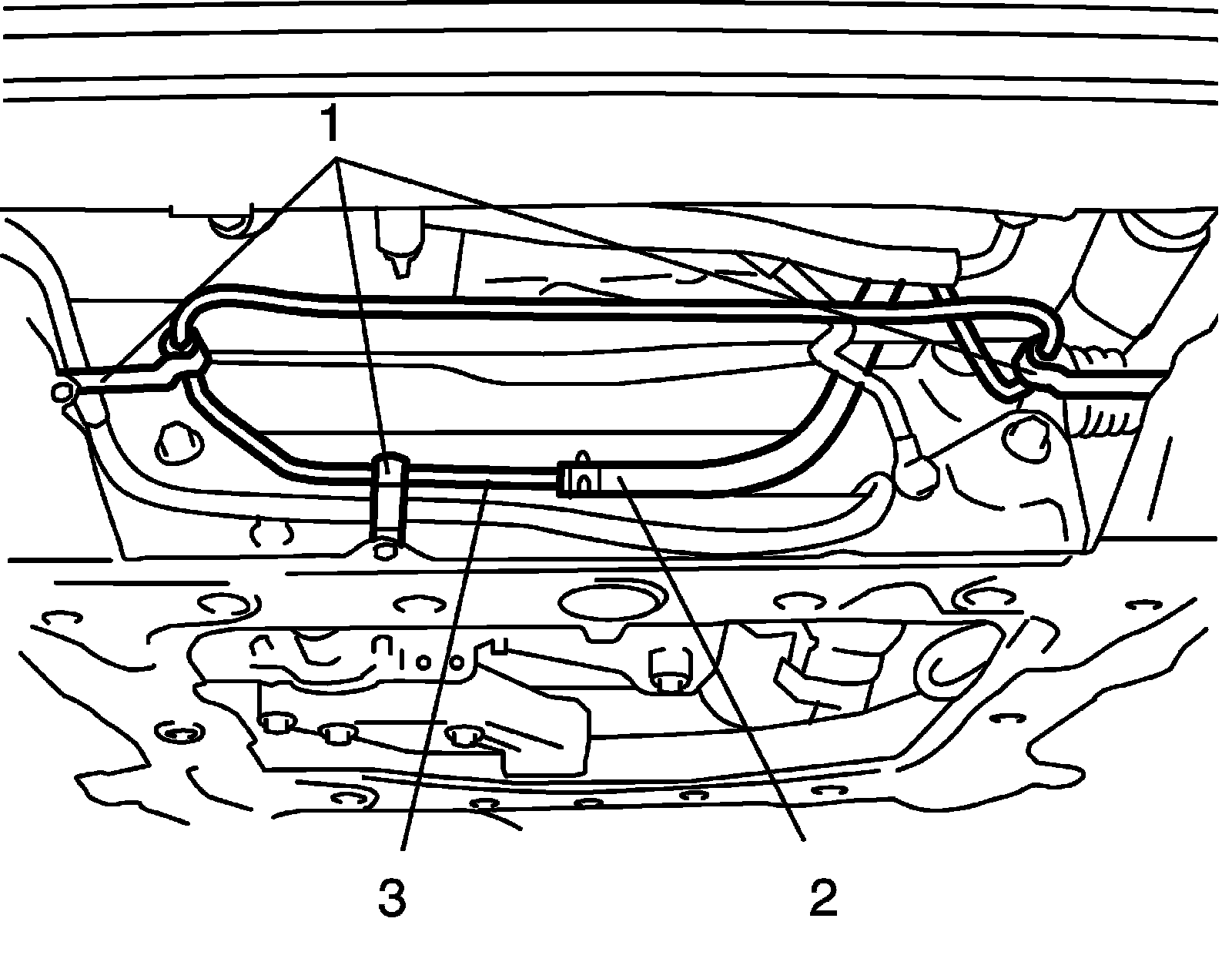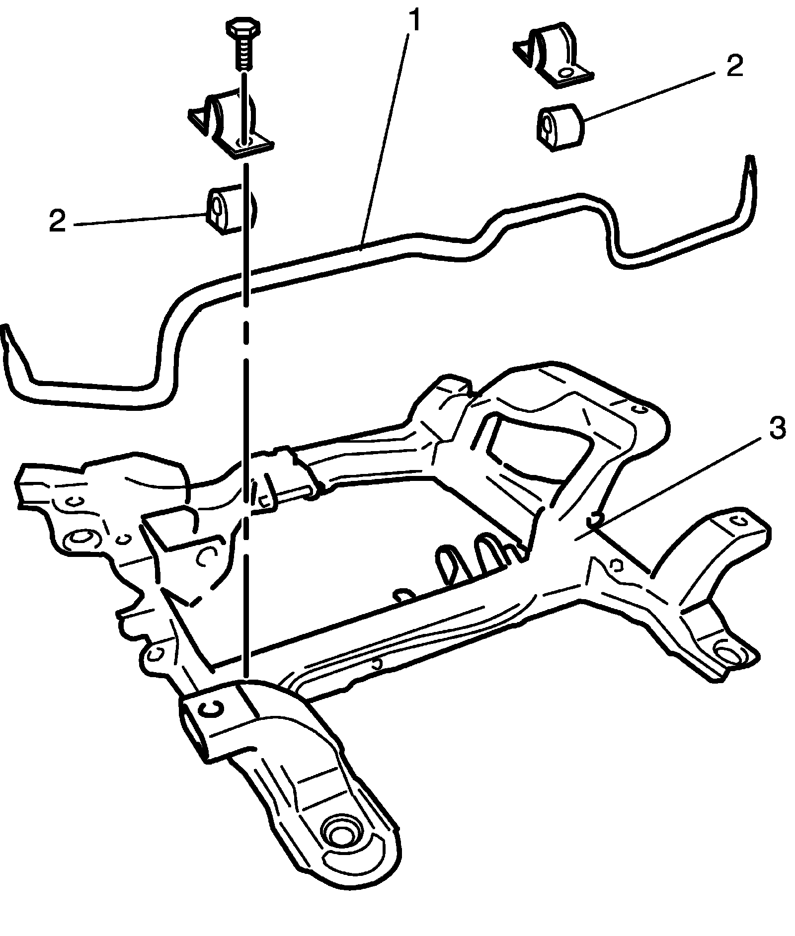 2) Install stabilizer bar (1), stabilizer bushing (2) and stabilizer mounting bracket (3) to suspension frame.