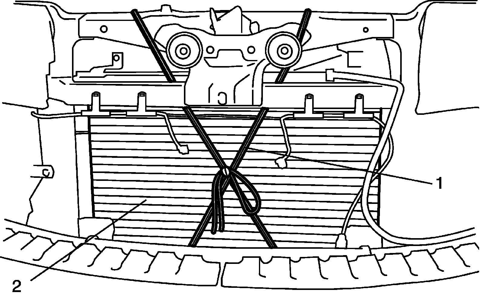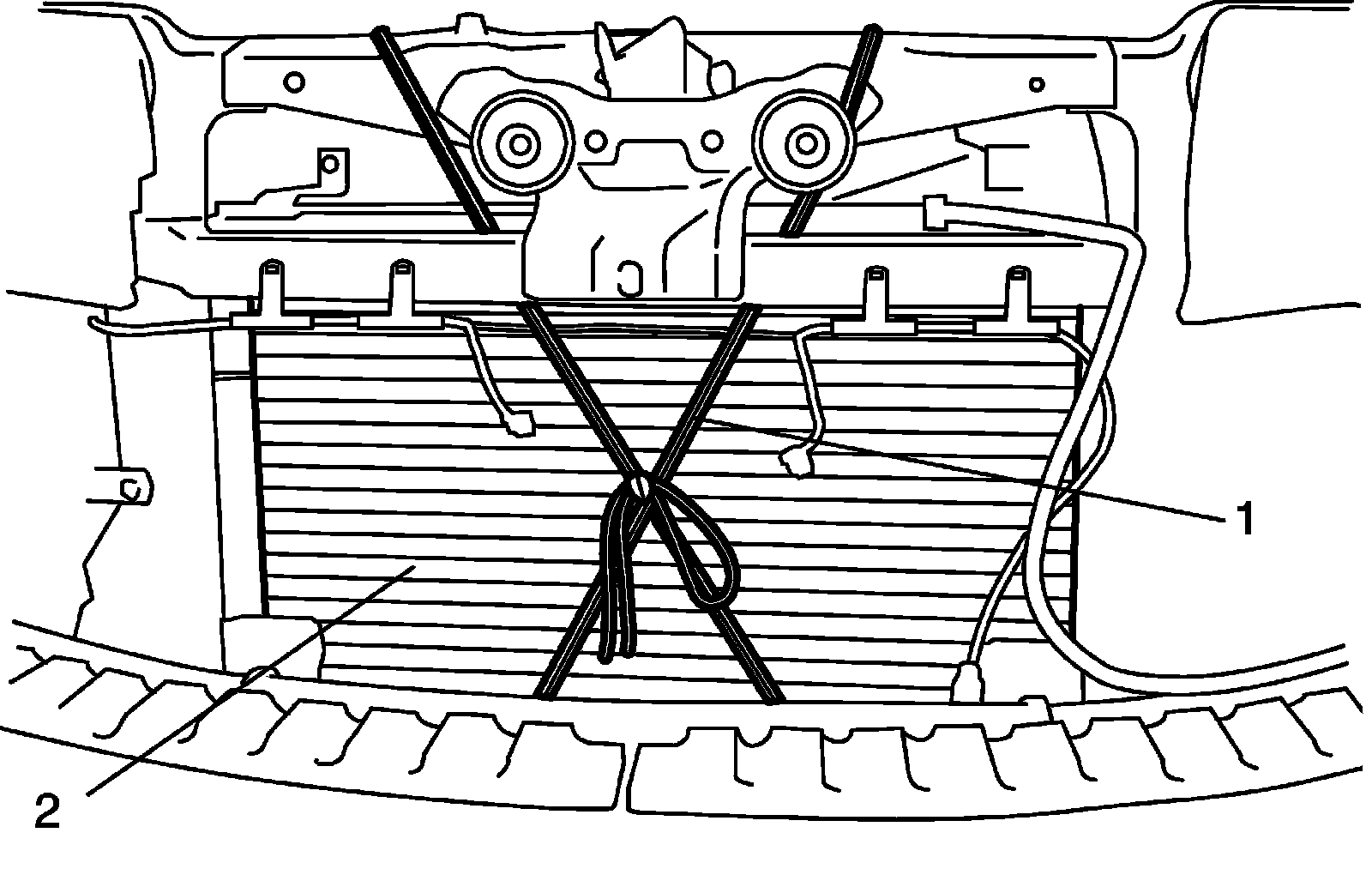 10) Fix radiator (2) to body with rope (1) to avoid the radiator (2) fall off when front suspension frame lowered.