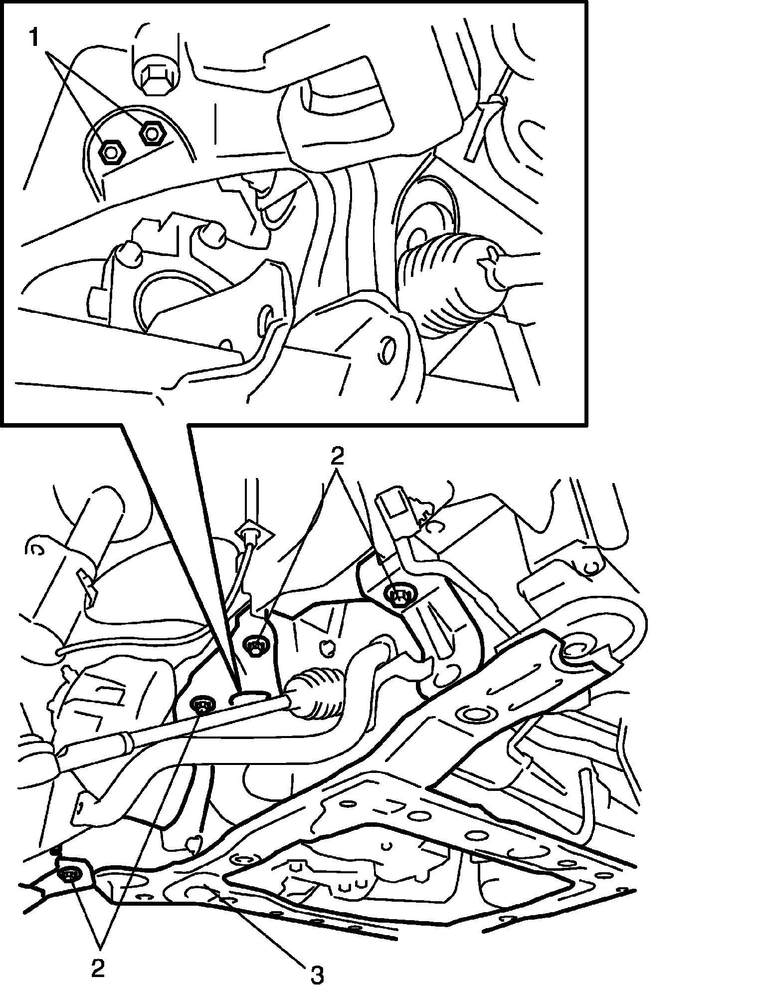 16) Remove stabilizer bar (1) and bushing (2) from suspension frame (3).