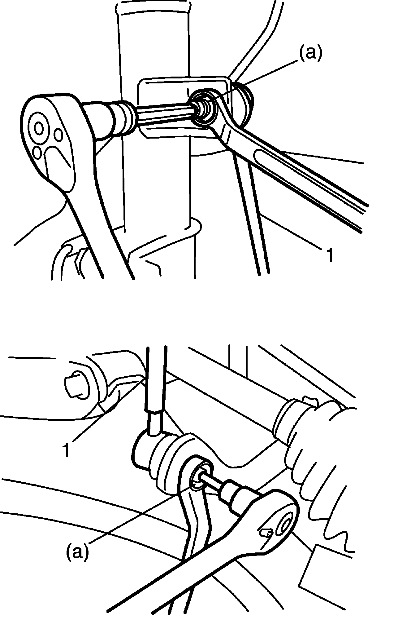 13) Install stabilizer joints (1), and tighten nuts to specified torque. When tightening, hold stud with hexagon wrench. Tightening torque Stabilizer joint nut (a): 60 Nm (6.0 kg-m, 43.5 ft. lb.)