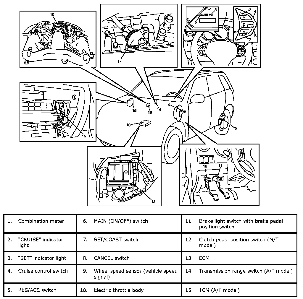 Cruise Control System ConstructionThe cruise control system is a device which maintains a preset vehicle speed while driving at a high speed, e.g., on a highway. It allows the driver to drive his vehicle at a constant speed of 40 km/h (25 mile/h) or higher without depressing the accelerator pedal. The system also has such functions as to change the vehicle speed without operating the accelerator pedal (but using SET/COAST and RES/ACC switches), cancel cruise control (CANCEL switch) and resume the speed in memory automatically after cruise control is cancelled (RES/ACC switch). The system mainly consists of electric throttle body assembly, ECM, cruise control switch (MAIN (ON/OFF) switch, SET/COAST switch, RES/ACC switch and CANCEL switch), etc.