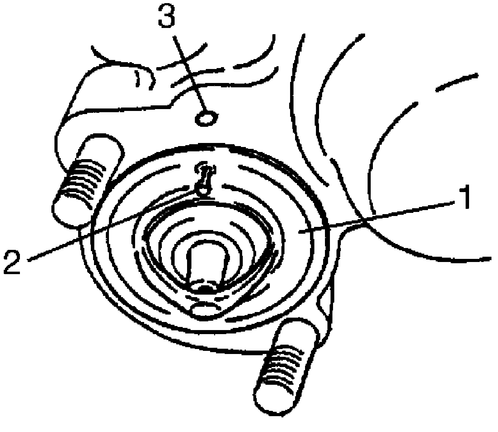 ^ When positioning thermostat (1) and O-ring on thermostat case, be sure to position it so that air bleed valve (2) comes at match mark (3) and into the recession of thermostat case.