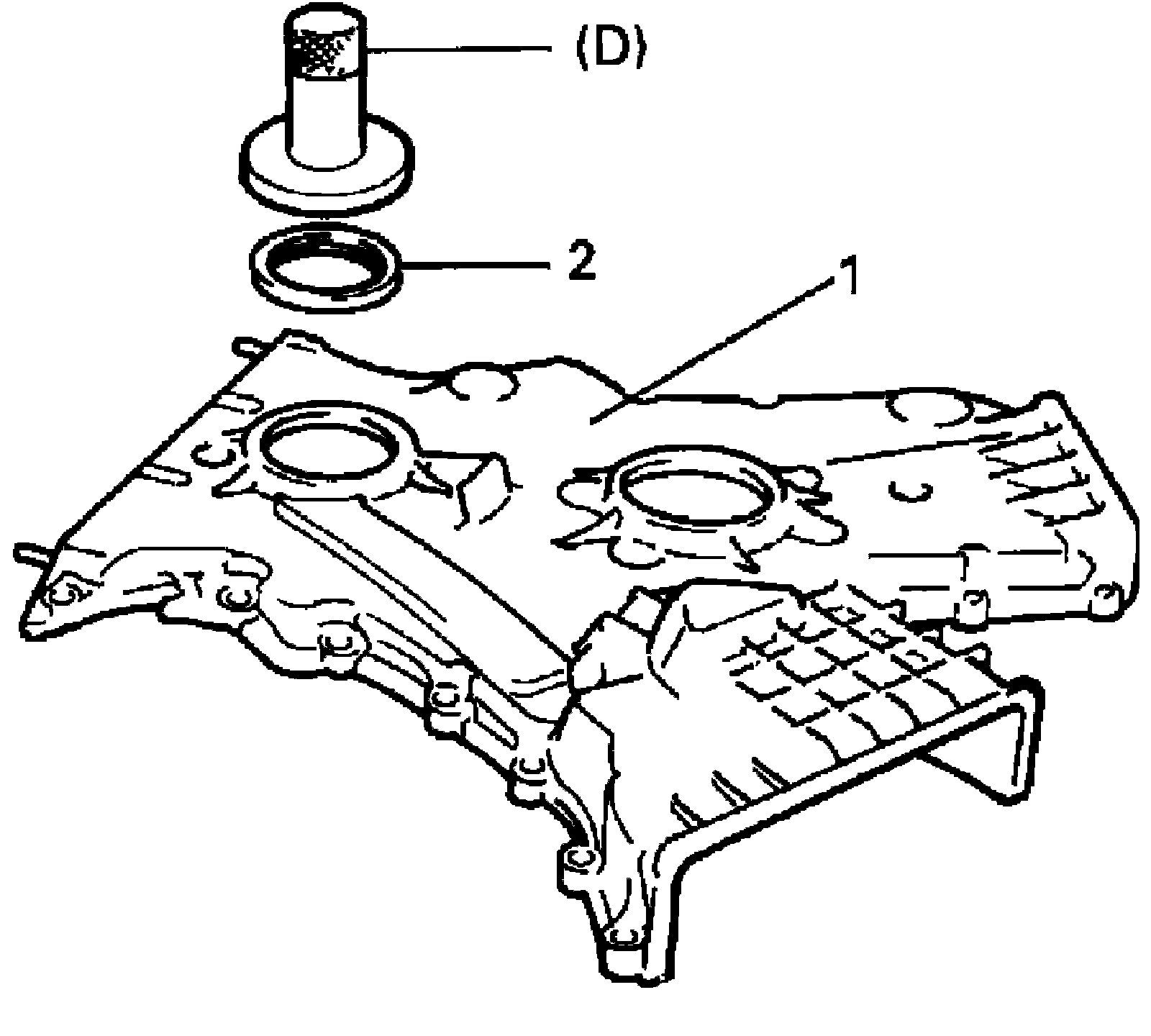 ^ Apply engine oil to new oil seal lip and water pump O-ring. Using special tool (bearing installer), install new oil seal (2) with its surface is flash with edge of timing chain cover (1).