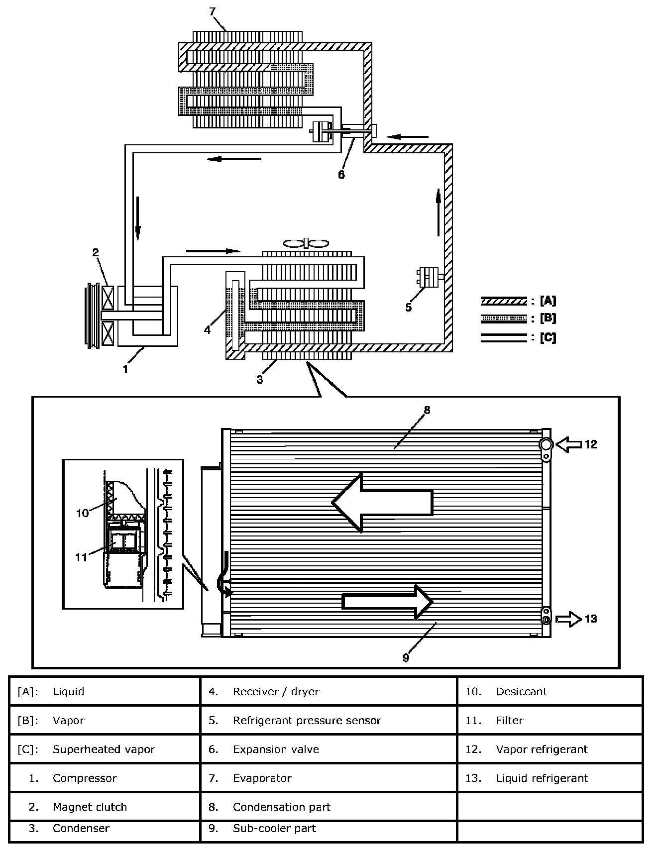 Sub-Cool A/C System DescriptionIn the sub-cool A/C system (condenser (3) integrated with receiver / dryer (4)), the inside of the condenser is divided into the condensation part and the sub-cooler part, and the receiver / dryer is located between those. In the receiver / dryer (4), the refrigerant is separated into the vapor refrigerant and the liquid refrigerant. Only the liquid refrigerant is delivered to the sub-cooler part of the condenser. The refrigerant is supercooled by the sub-cooler part of the condenser.