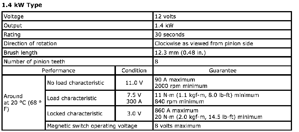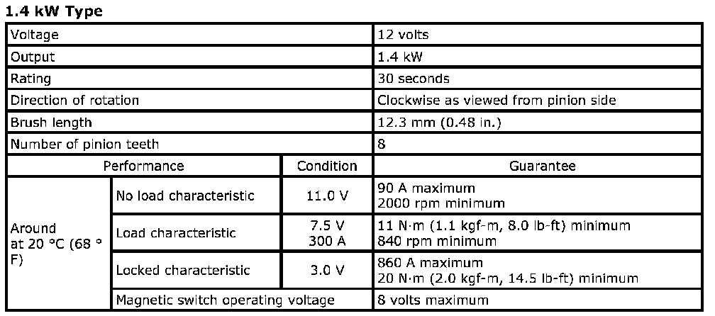Starting Motor Specifications: