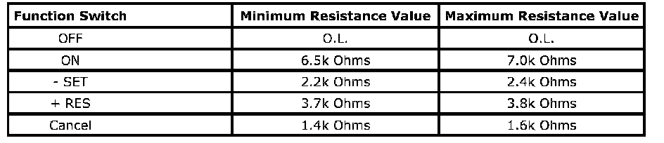 3. Cruise switch ON, measure the resistance between terminals 1 and 3 at the cruise control switch side of the connector. Individually activate and hold each cruise control function switch and compare the resistance reading to the values on the schematic for the ON/OFF, SET -, the RES +, and the Cancel switches.
