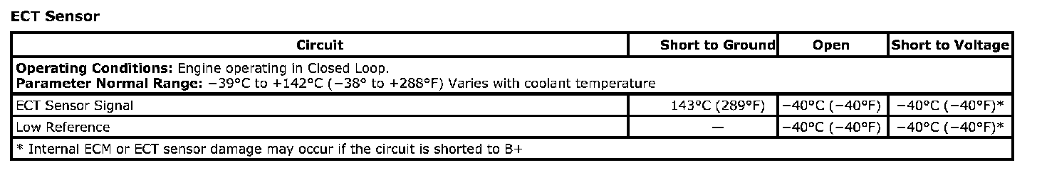 ^ A short to ground or voltage through a conductive material or fluid could set this DTC. Inspect the ECT sensor for evidence of coolant leaking into the connector body.