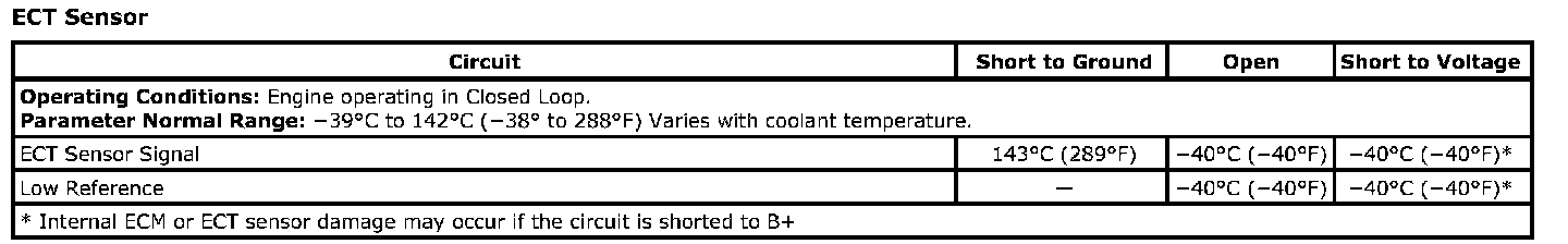 The ECM detects that the ECT is less than -42 °C (-43.6 °F) for greater than 1 second or a cumulative of 10 seconds. The scan tool is limited to -40 °C (-40 °F), so the diagnostic procedure uses -39 °C (-38 °F) to determine if there is an ECT condition.