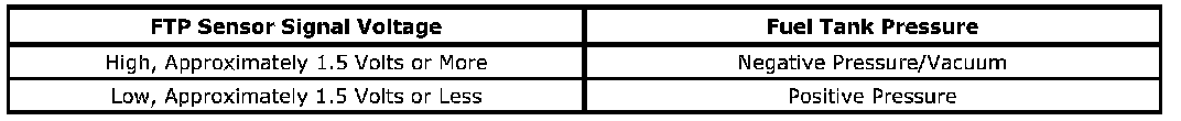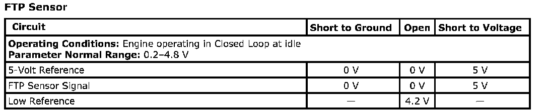 The ECM detects the FTP sensor signal voltage is less than 0.2 volt for 4 seconds or for a cumulative of 30 seconds.
