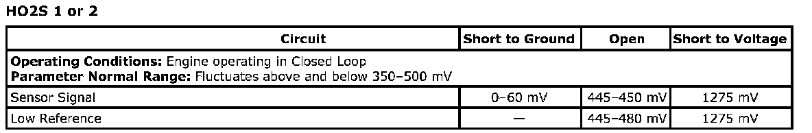 ^ If greater than the specified range, test the signal circuit of the HO2S sensor for a short to voltage. If the circuit/connections test normal, replace the ECM.