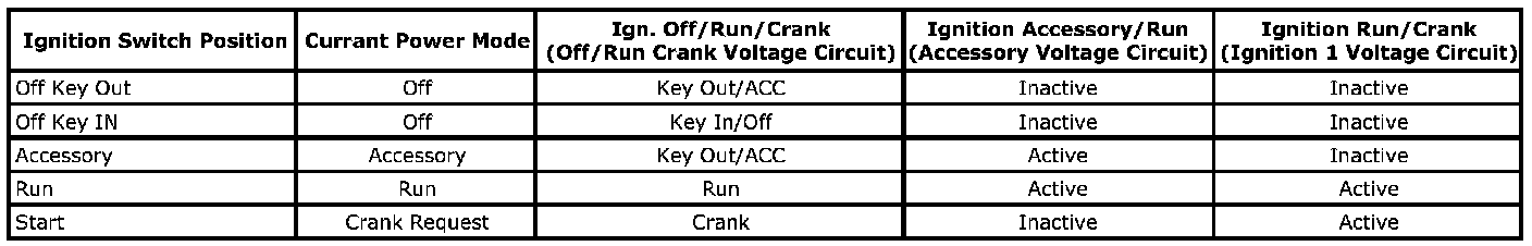 ^ The power modes and controls are determined using BCM logic. Comparing the Body Control Module Power Mode data display parameters listed in Circuit/System Verification will determine if there is a power mode fault.