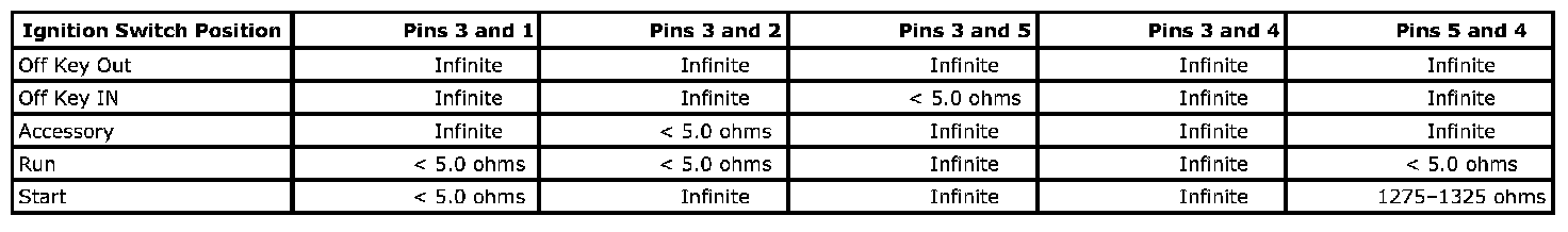 Using the Resistance Test given, check the resistance between the pins of the ignition switch listed in each switch position listed.