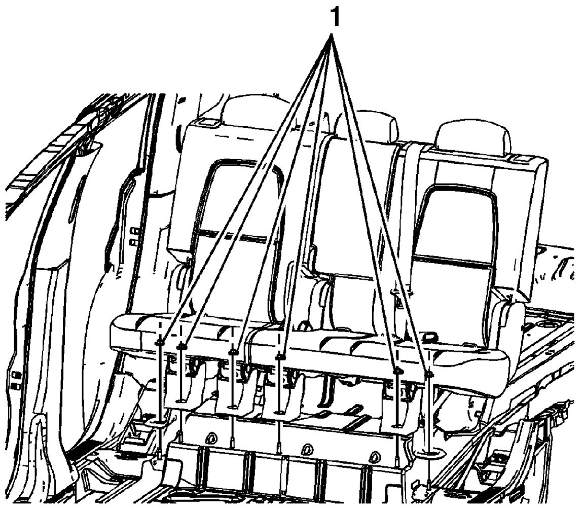 2. Remove the stud caps and the 6 attachment nuts (1) from the front and side risers of the seat.