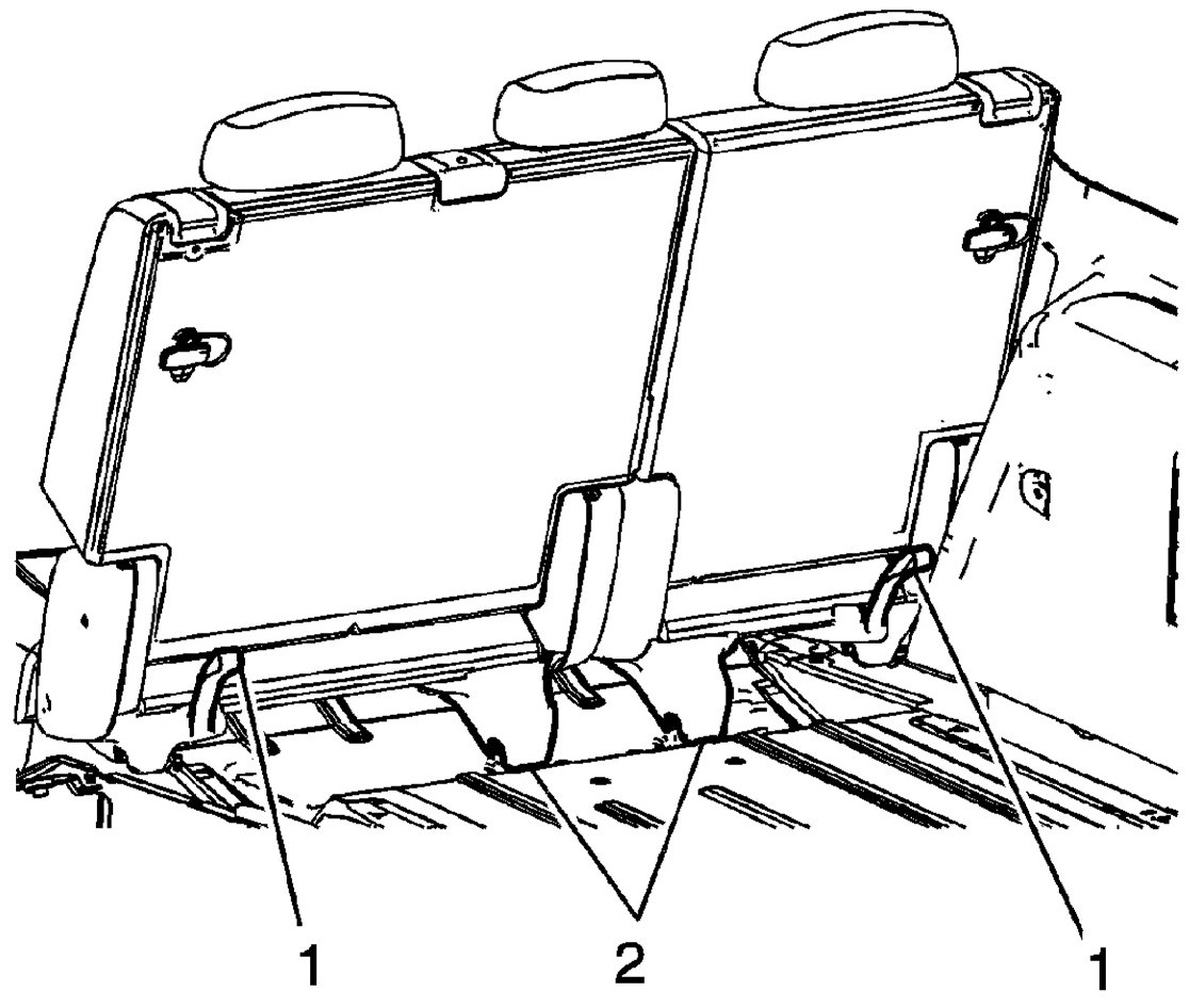 3. Pull the latch release strap (1) at the rear of the seat to release the floor latches (2).