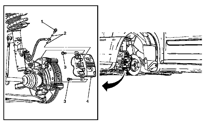 3. Inspect for brake fluid leakage around the caliper piston dust boot seal (2) and on the disc brake pads. If there is any evidence of brake fluid leakage, the brake caliper requires overhaul or replacement.
