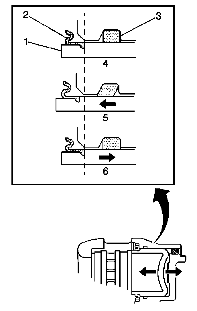 3. While the brake system is at rest (4), observe the position of the caliper piston (1) in relation to the caliper housing.