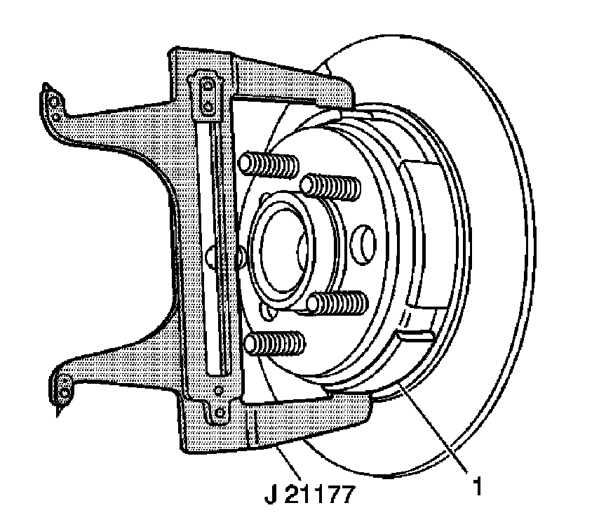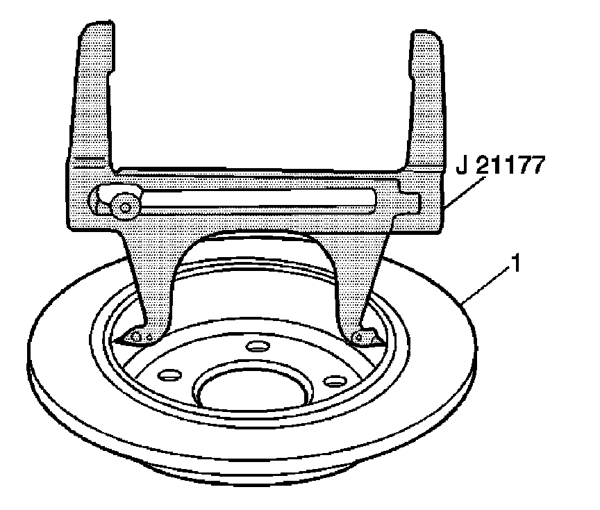 8. Place the inside measurement contacts of the J 21177-A at the widest point of the drum portion of the brake rotor (1).