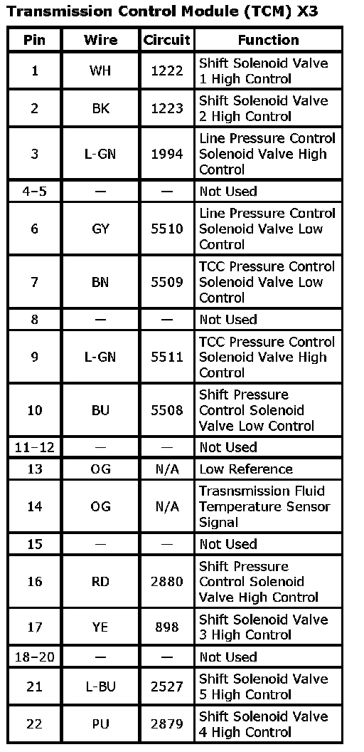 Transmission Control Module (TCM) X1Connector Part Information