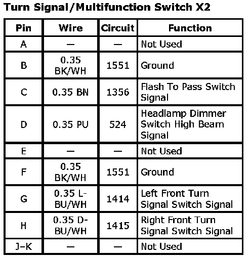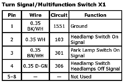 Turn Signal/Multifunction Switch X1Connector Part Information