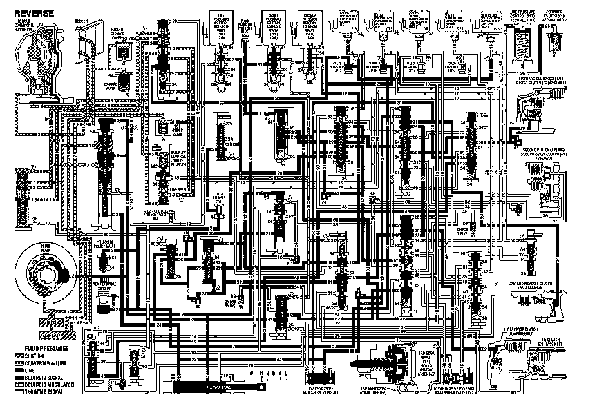 ReverseWhen the gear selector lever is moved to the REVERSE (R) position (from the PARK position) the following changes occur in the transmission's hydraulic and electrical systems.
