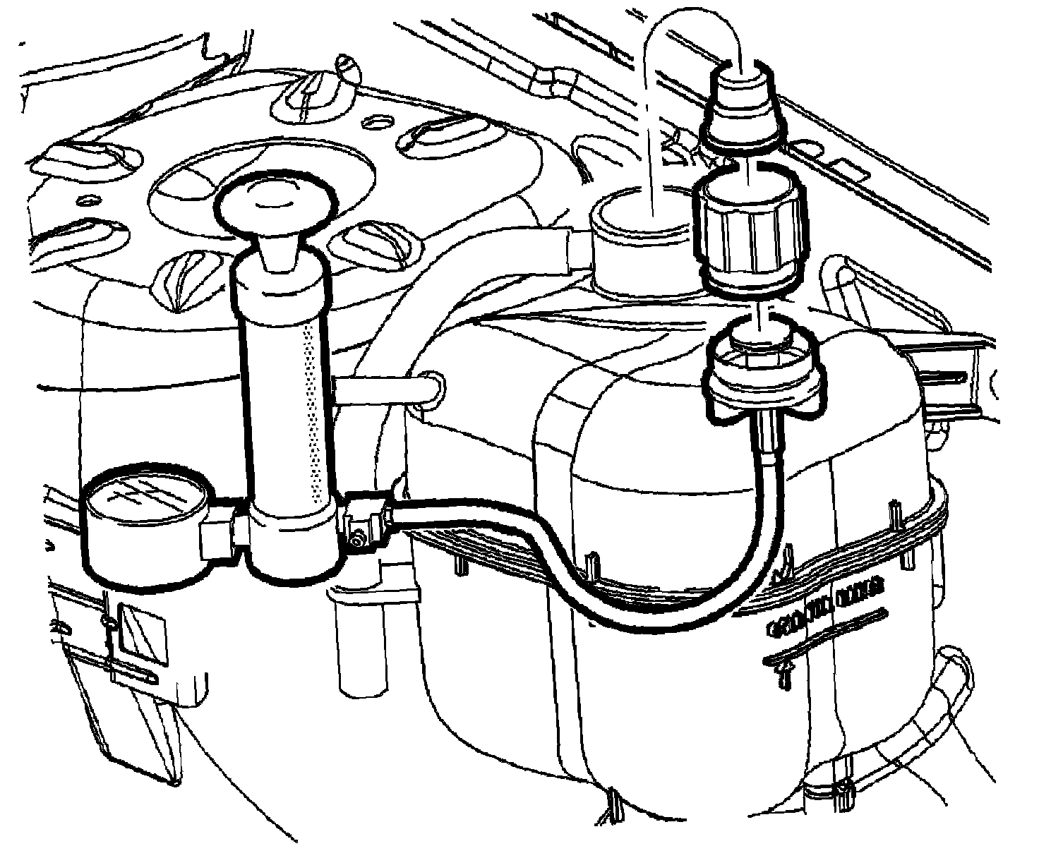 ^ Wet the rubber gasket of the cap adapter J 42401-3 (cap) and install on surge tank.