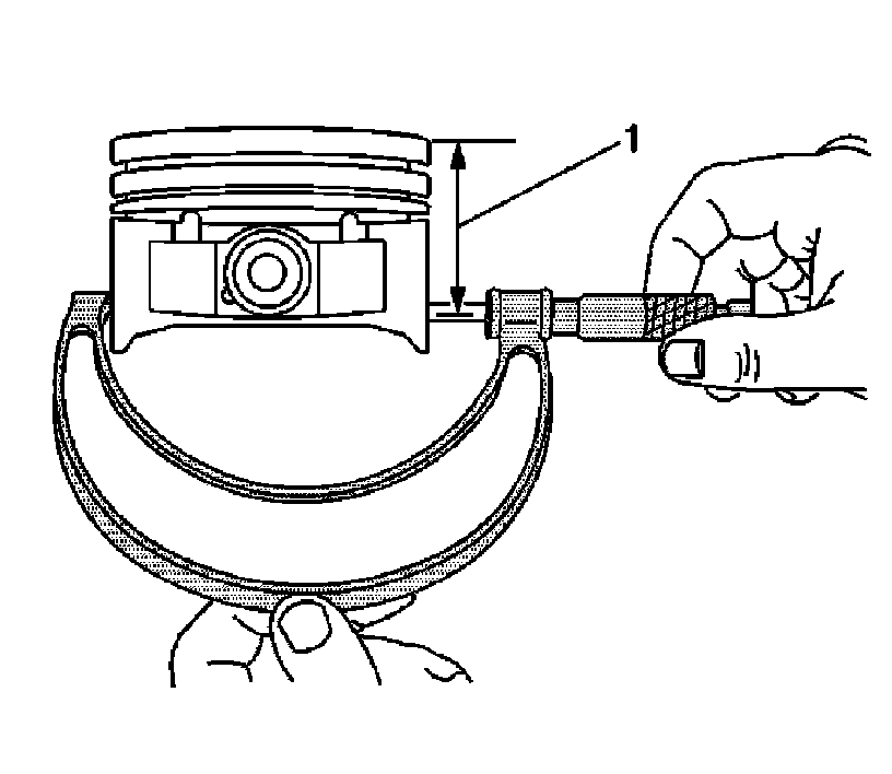 a. Using an outside micrometer, measure the width of the piston at 30 mm (1.181 in) below the crown, top (1), at the thrust surfaces of the piston, perpendicular to the piston pin centerline.