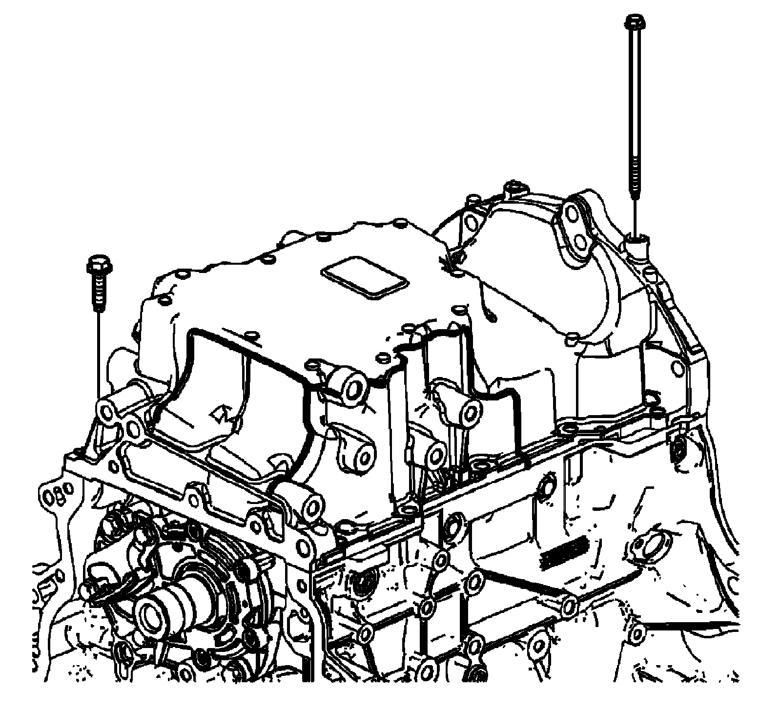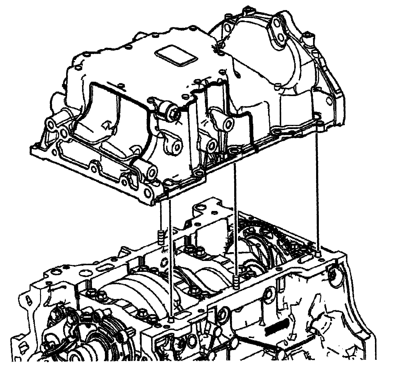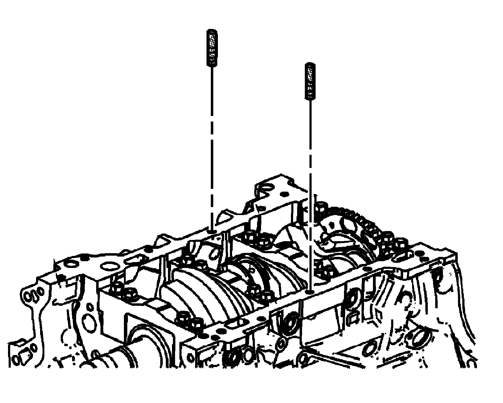 1. Install the 8 mm (0.315 in) guides from the EN 46109 into the center oil pan rail bolt hole on each side of the engine block.
