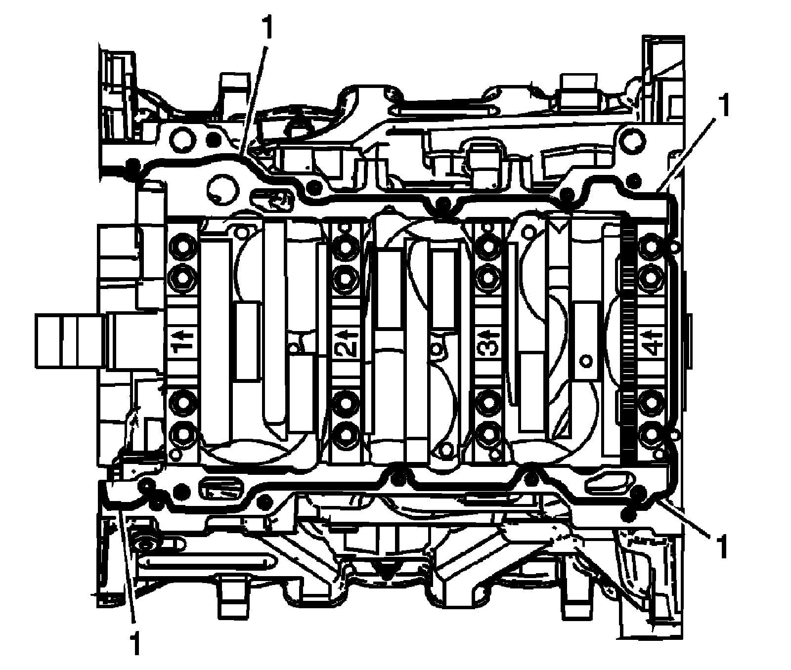 2. Place a 3 mm (0.118 in) bead (1) of RTV sealant, GM P/N 12378521 (Canadian P/N 88901148) or equivalent, on the block pan rail and the crankshaft rear oil seal housing.