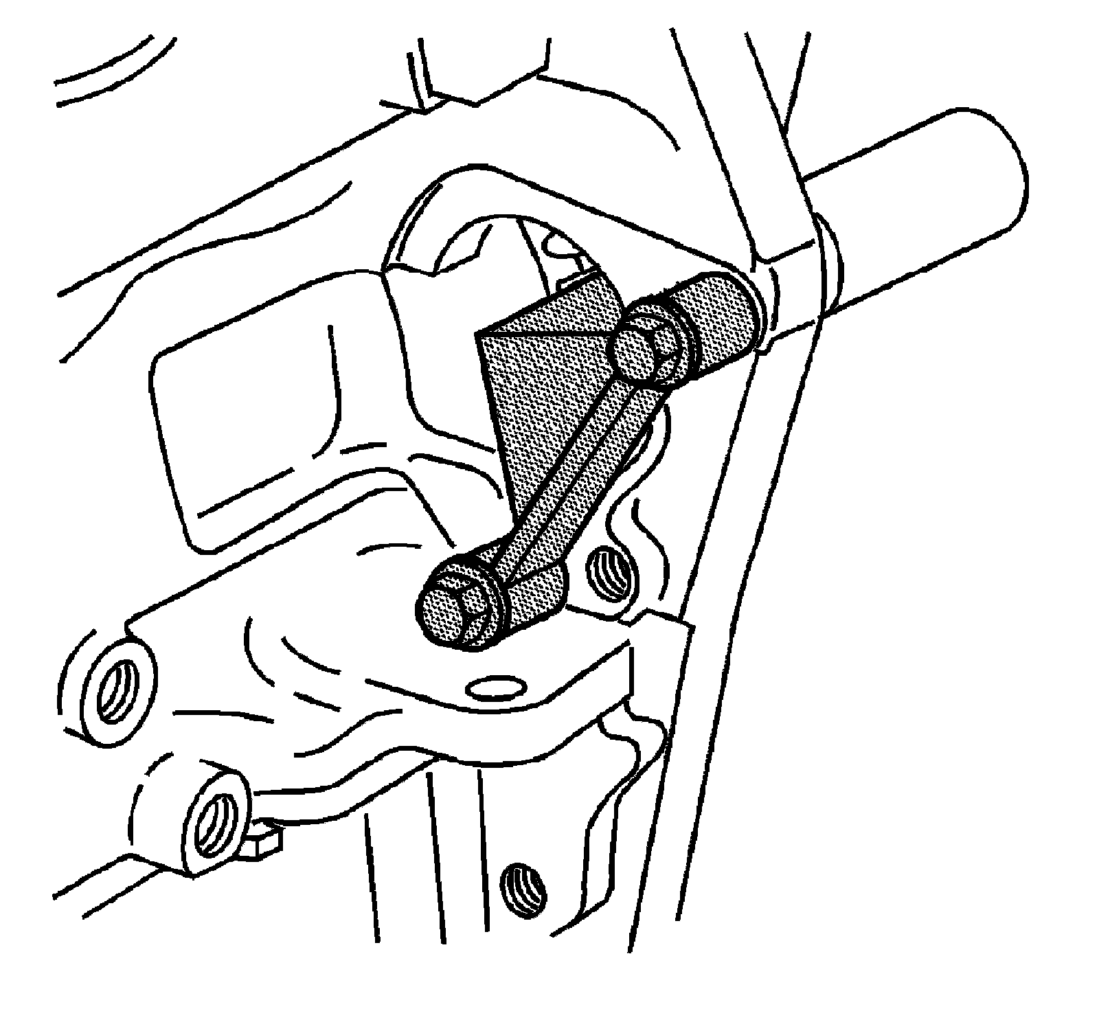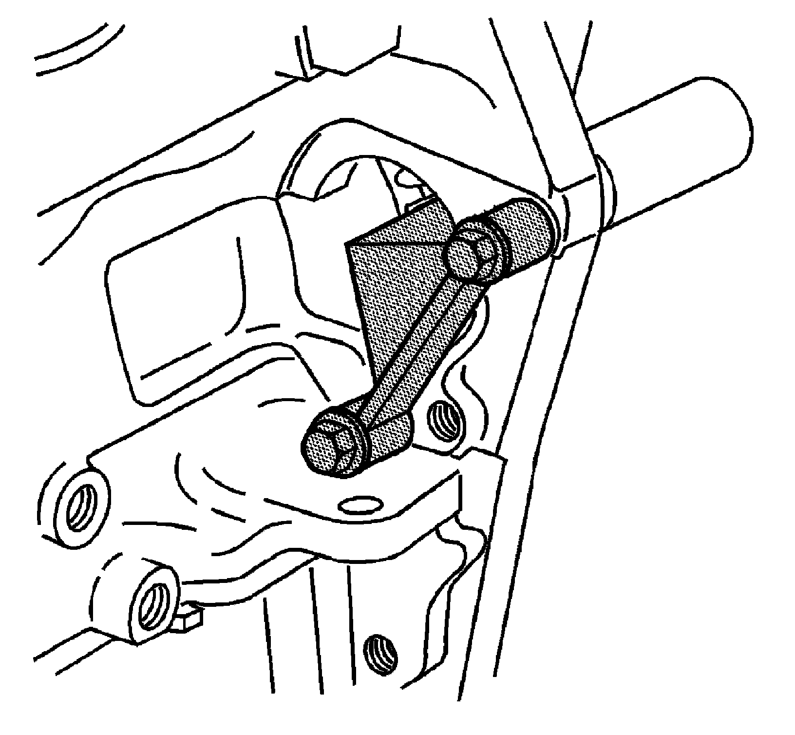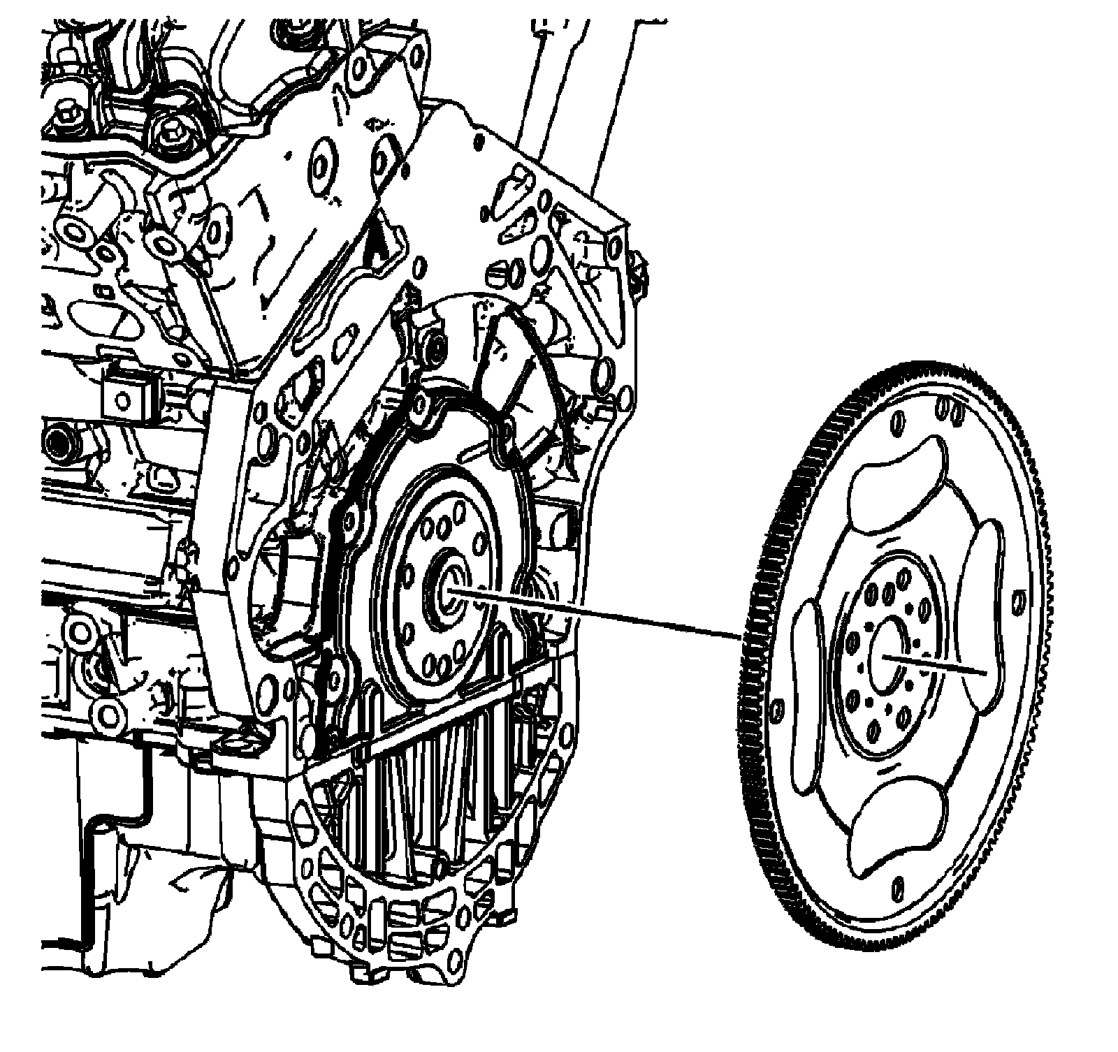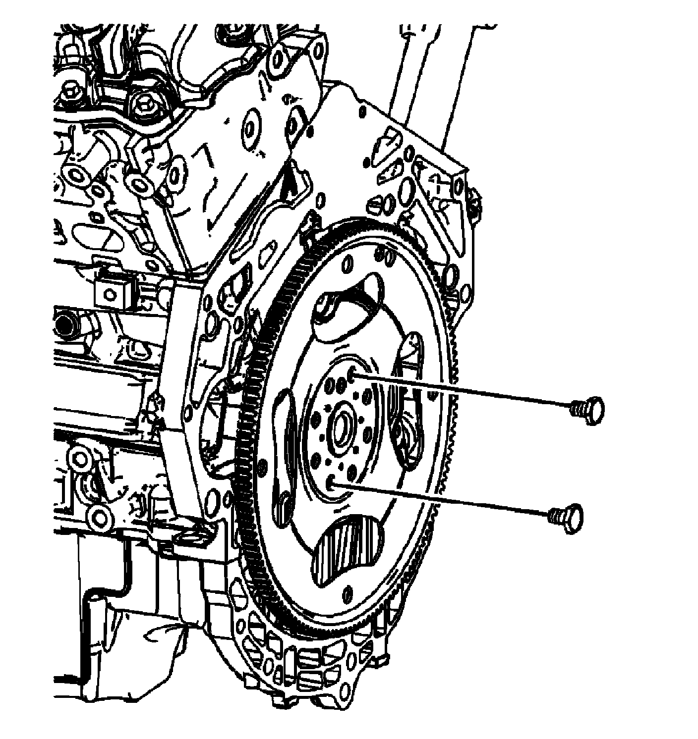 2. Install 2 NEW bolts in location at the top and bottom of the engine flywheel bolt pattern allowing the engine flywheel to hang in position.