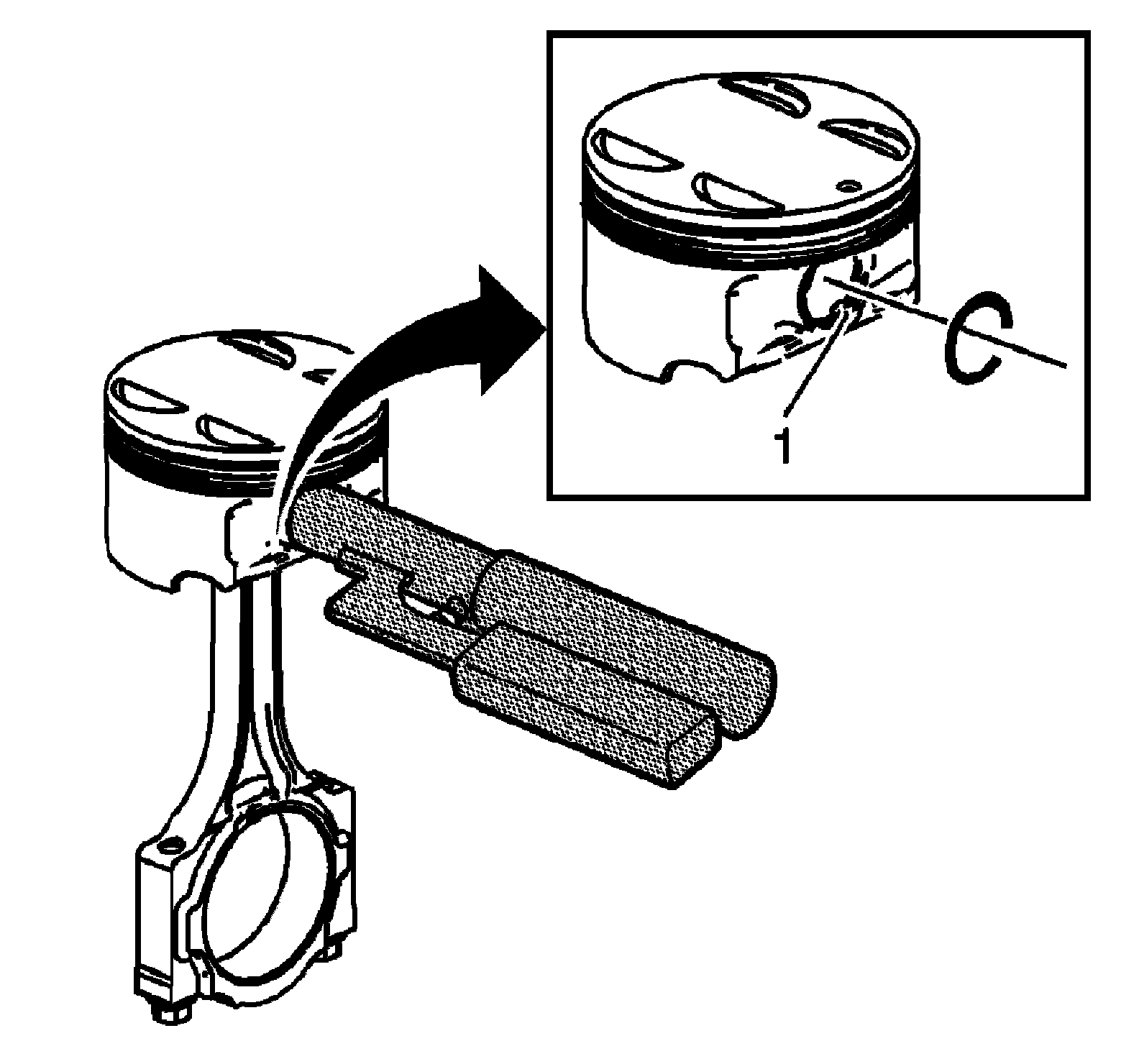 2. Using the EN-46745, remove the piston pin retainers by using the removal access notch (1) in the side of the piston. Discard the piston pin retainers.
