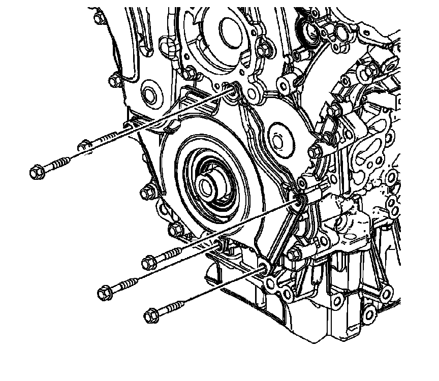 5. Remove the engine front cover bolts that hold the engine front cover deadener into position.