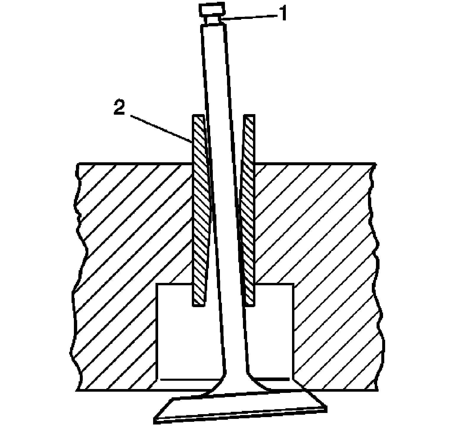 1. Measure the valve stem (l)-to-guide (2) clearance. Excessive valve stem-to-guide clearance may cause an excessive oil consumption and may also cause a valve to break. Insufficient clearance will result in noisy and sticky functioning of the valve and will disturb the engine assembly smoothness.