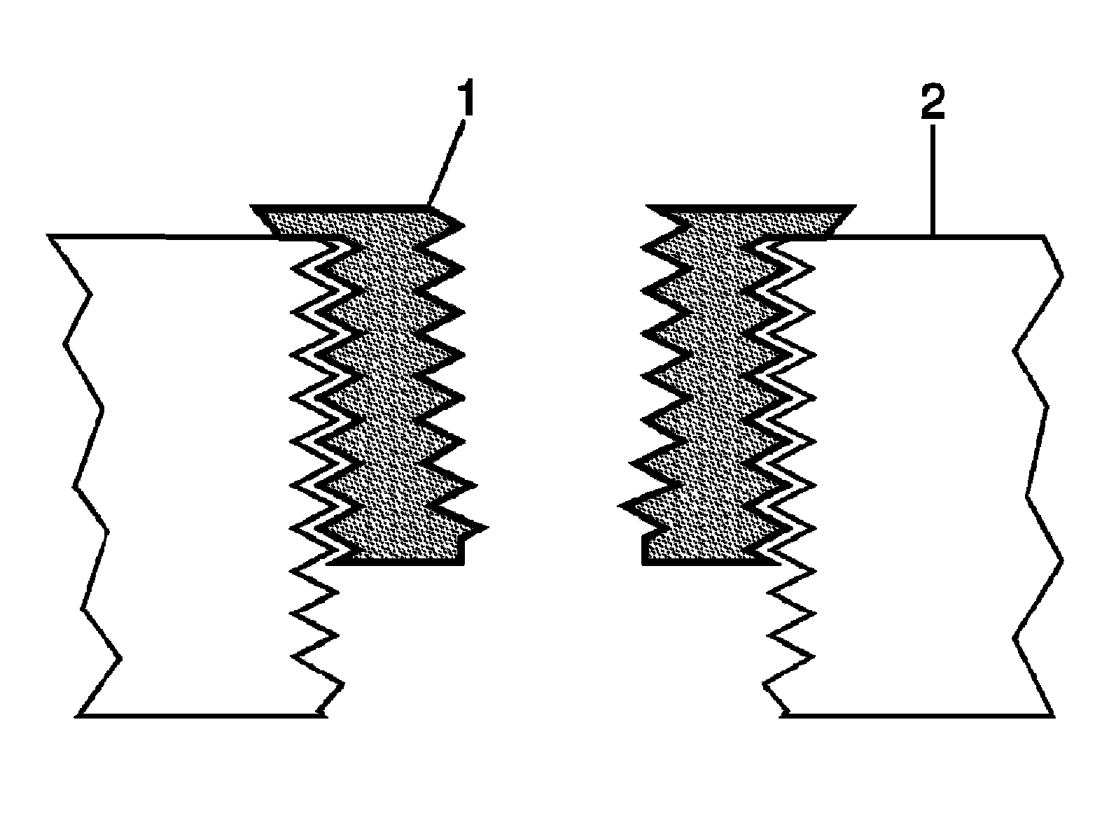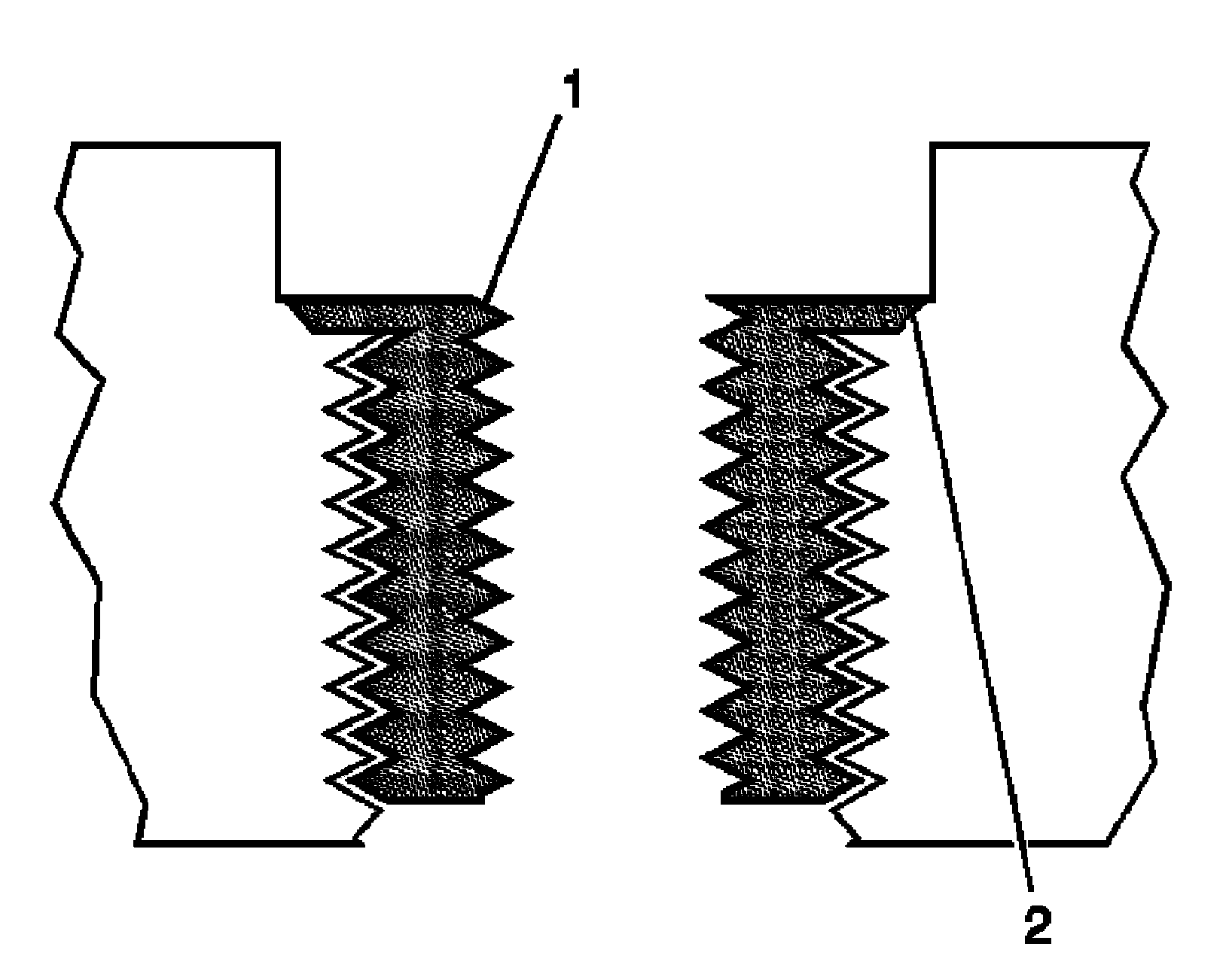 11. Apply threadlock sealant GM P/N 12345493, (Canadian P/N 10953488), J 42385-109, LOCTITE 277(R) or equivalent (1) to the insert OD threads (2).