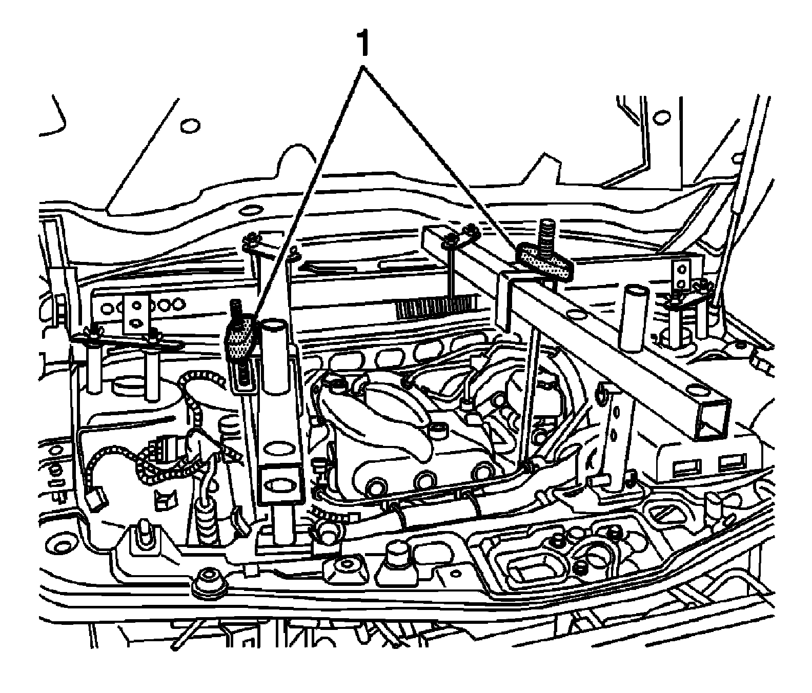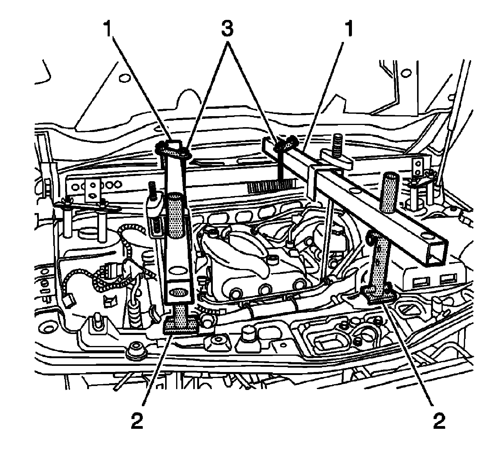 4. Install a 127 cm (50 in) engine support fixture cross bar J-28467-B (3) transversely across the vehicle between both J 28467-5 strut tower adapters (2).