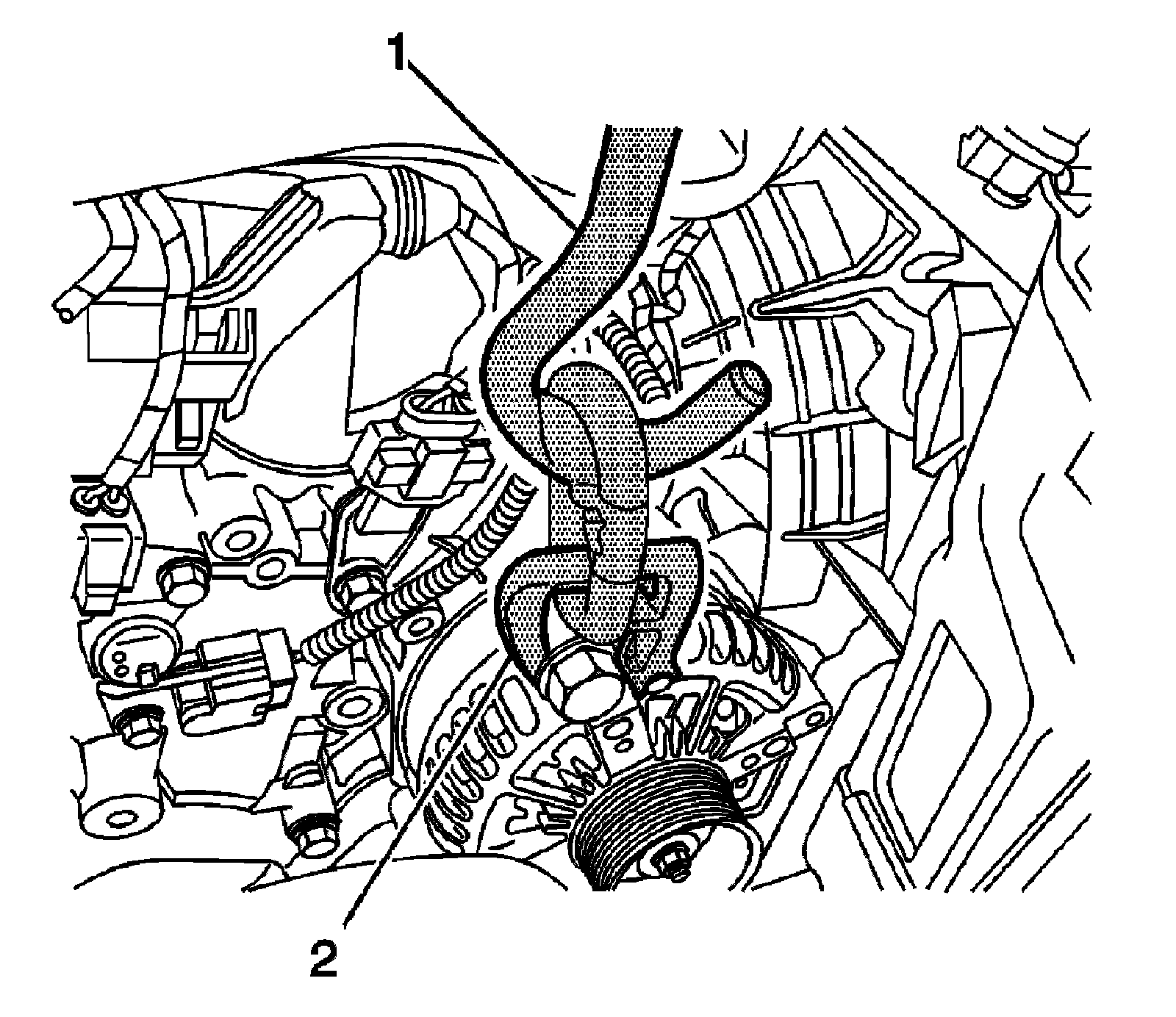 7. Remove the alternator bolt (1), then install the alternator bolt with the engine support bracket J 424511 to the engine.