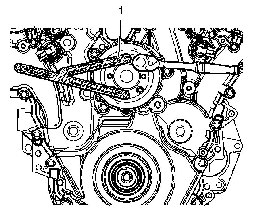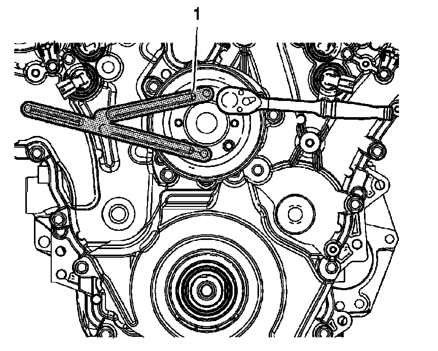 1. Install the EN 46104 (1) onto the water pump pulley.