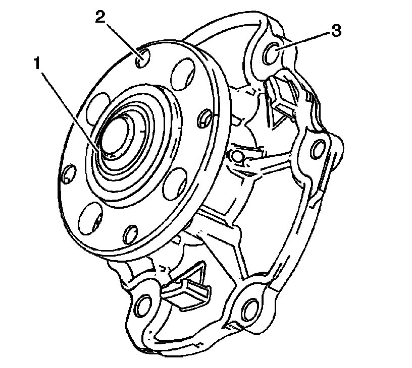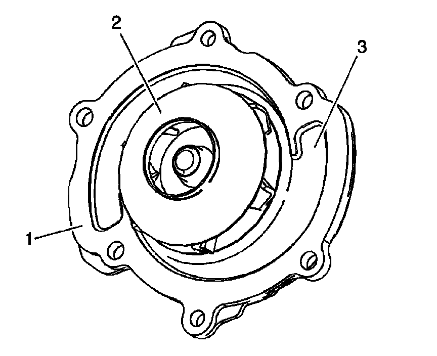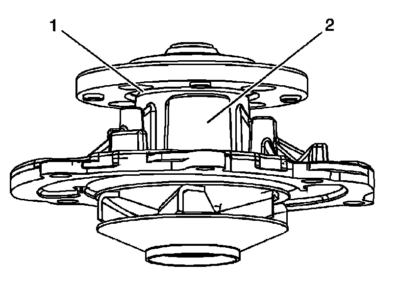 3. Examine the water pump shaft (1) and the weep hole reservoir (2) in the water pump body for signs of leakage. If coolant leakage is evident, replace the water pump.